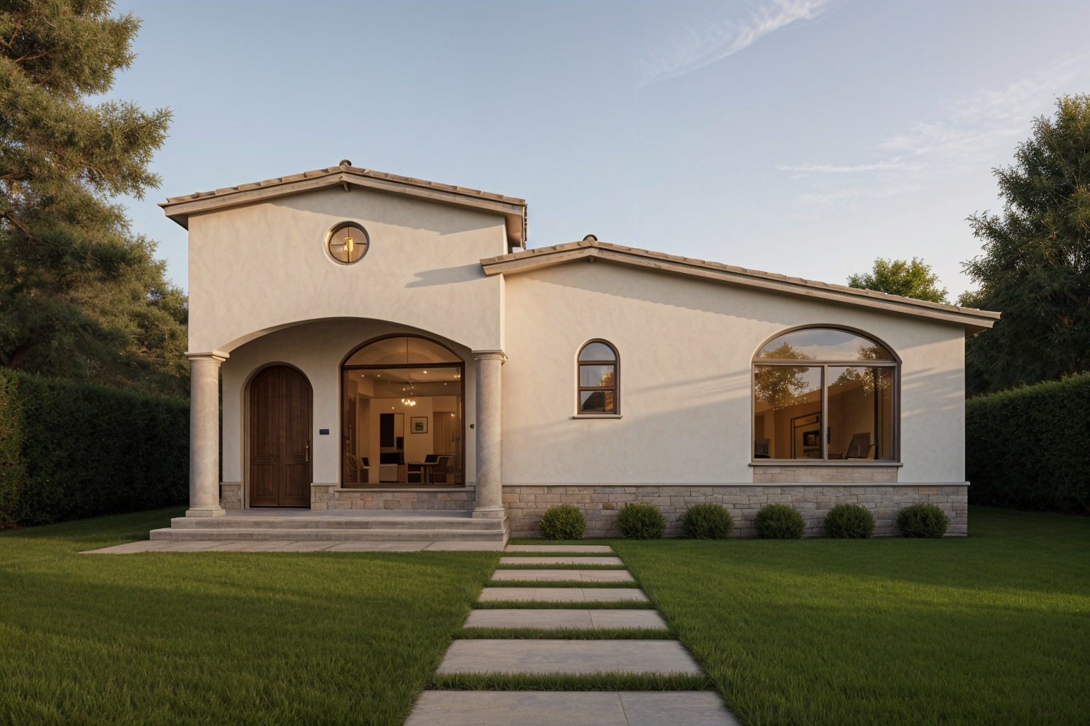 bobby mcalpine exterior shot modernist exterior shot a modern single story house with a stone facade and wooden beams surrounded by lush green lawn and minimalistic landscaping the metal standing roof is dark grey and there are two symmetrical wooden pergolas on each side of the house the windows and sliding doors are large and transparent providing a seamless indoor outdoor connection in the foreground a crystal clear turquoise swimming pool bordered by light grey stone reflects the sky the atmosphere is serene and inviting with a hint of luxury the trees in the background are light grey blending softly into the peaceful setting architecture add a two car carport to the side of the house show tree foreground landscaping add windows and french doors architecture