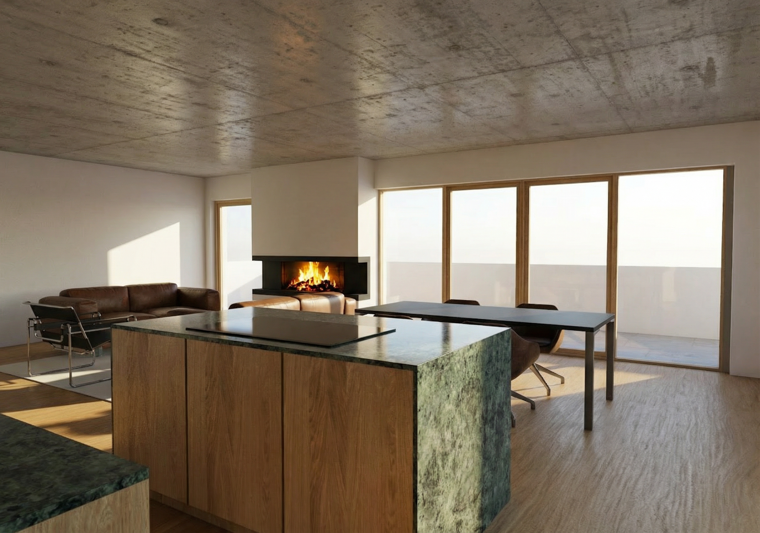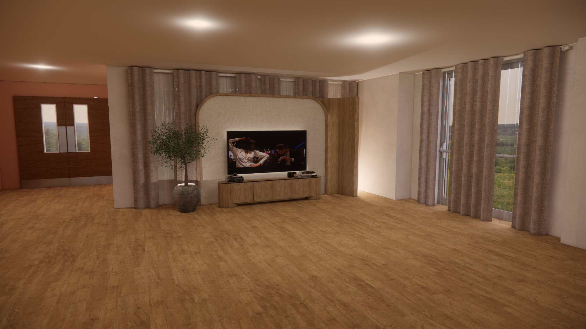 add people in the wheelchairs who are watching tv add a person of the left who is walking past them keep the materials like in the render the panel is textile add typical office panel ceiling and general lighting general lighting should be across the room make render photo realistic