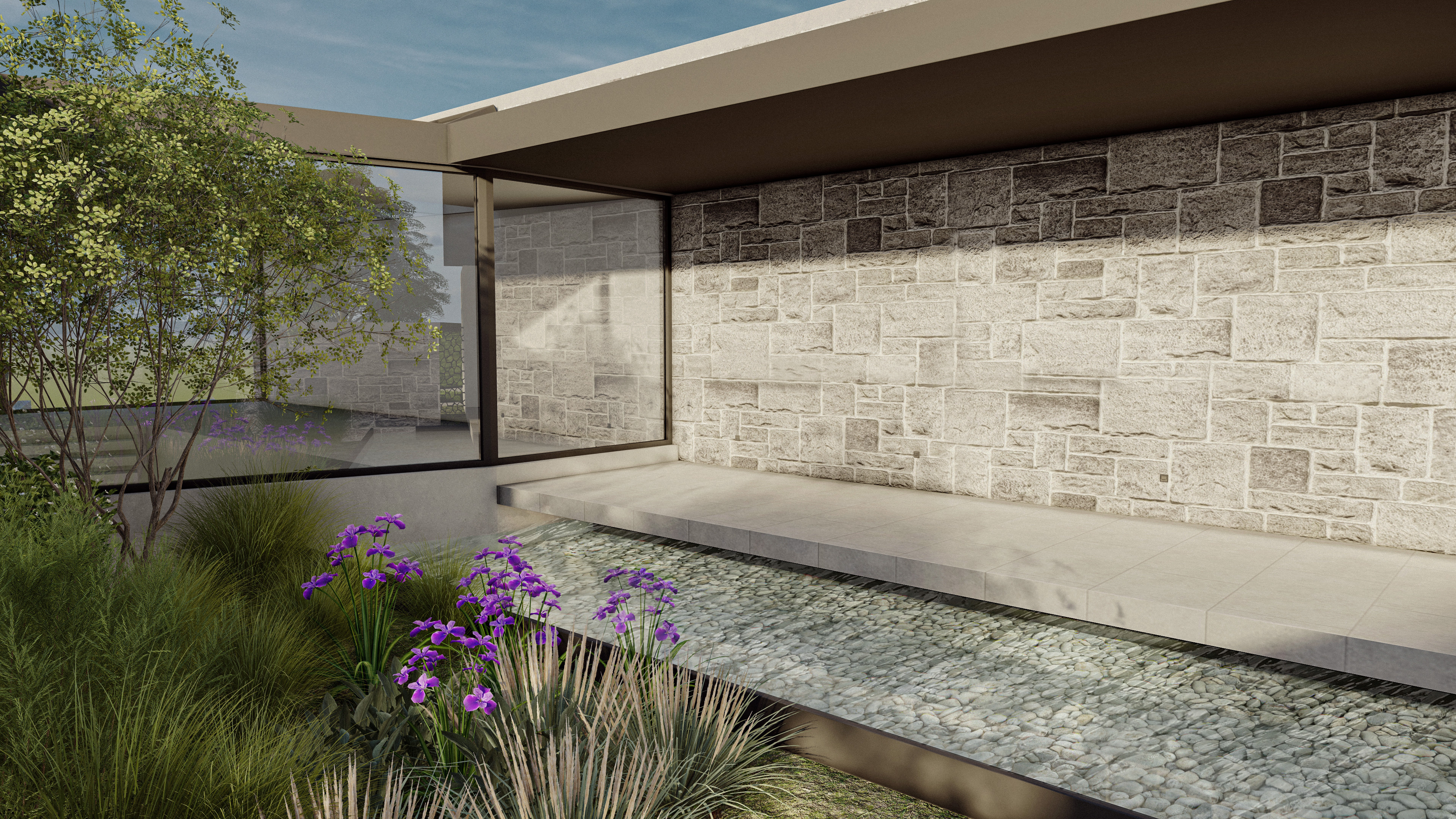 day to mid night transition create a 5 second cinematic video using the provided rendering as the sole visual reference animate a smooth continuous day to midnight transition begin with a clear blue sky and mid day natural daylight gradually transition into a evening sky approaching night with no abrupt shifts exposure color temperature and contrast should evolve realistically and seamlessly over time as daylight fades subtly and progressively introduce artificial lighting only from the following sources downlighting from the pathway ceiling mainly casting onto the pathway a gentle glow from the underside of the pathway casting downward onto the water gently light up the plants do not reveal any light source do not show any light sources on any surfaces or in any reflections illumination must feel indirect and concealed no other lighting is allowed add gentle natural water ripples within the rill water is clear and transparent no splash or foam in water add mild reflection on water motion should be slow calm and physically plausible enhance and deepen glass reflections as lighting conditions change reflections must remain physically accurate stable and undistorted avoid flickering or reflection artifacts strictly preserve the original design no changes to architectural elements materials geometry or soft landscape no camera movement no object repositioning no framing or design alterations maintain a high end architectural visualization aesthetic realistic exposure and color response soft contrast smooth temporal consistency cinematic yet restrained realism throughout the clip