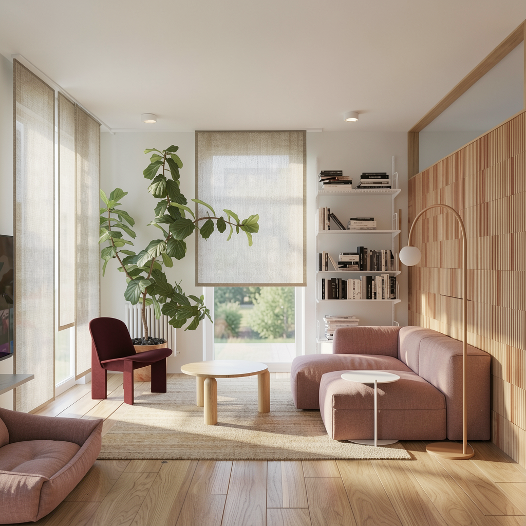 enhance the photorealism of this architectural visualization while preserving the design exactly as it is do not alter any materials colors textures finishes furniture layout proportions or architectural elements maintain all existing material tones and surface characteristics precisely as shown improve realism strictly through lighting and rendering refinement physically accurate artificial lighting simulation natural daylight entering from the background with correct light temperature separation realistic global illumination and secondary light bounce high dynamic range lighting hdr with balanced exposure soft natural contact shadows accurate ambient occlusion in corners and object intersections subtle physically correct reflections refined material roughness without changing material type or color micro contrast enhancement for surface depth extremely subtle surface imperfections fine micro variation only no texture change very delicate natural depth of field cinematic but neutral color grading no color shift no stylization ensure correct light interaction between artificial interior lighting and daylight from the background preserve the original atmosphere and composition no redesign no restyling no object modification final result should resemble a high end professional architectural photograph ultra realistic natural optically accurate well balanced and physically plausible the colour of the wood should stay warm and oak scene should be iluminated by daylight color and white balance protection preserve original white balance exactly as in the input image do not shift color temperature no cooling no warming do not modify tint no green or magenta shift preserve original color grading no additional saturation no vibrance boost no contrast based color enhancement no stylization no cinematic lut neutral color science accurate color reproduction maintain original rgb values and tonal relationshipsbehind the window there is building no trees
