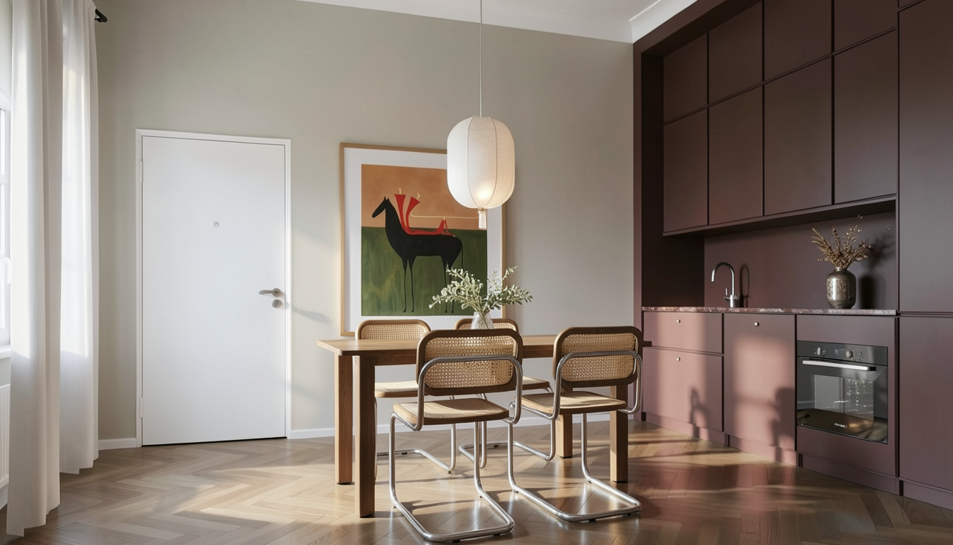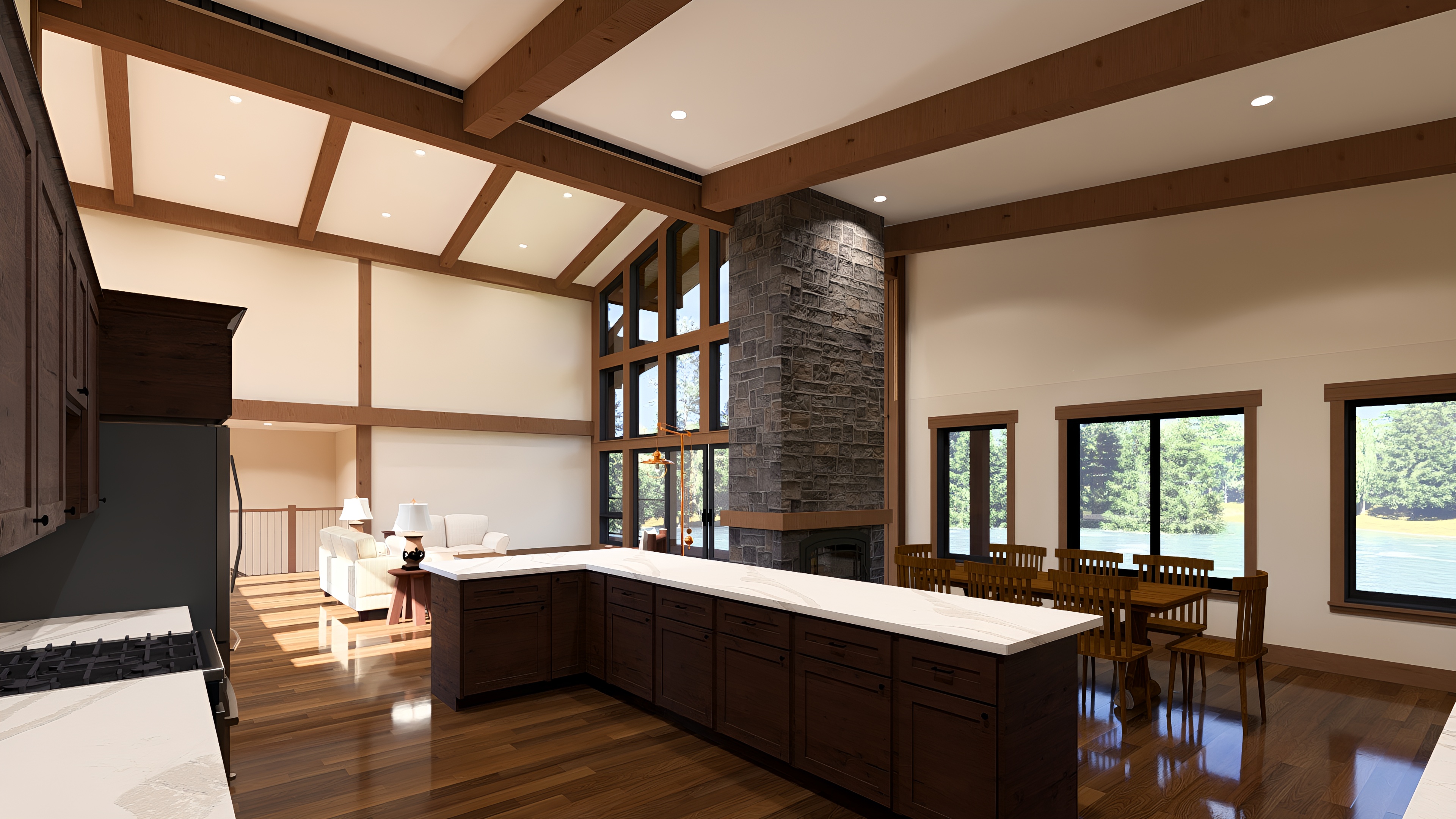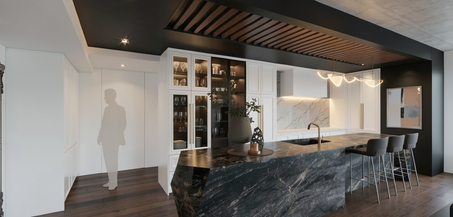 make this interior render look realistic add a chandelier and a few items on the kitchen counter add a hanging light over the dining table