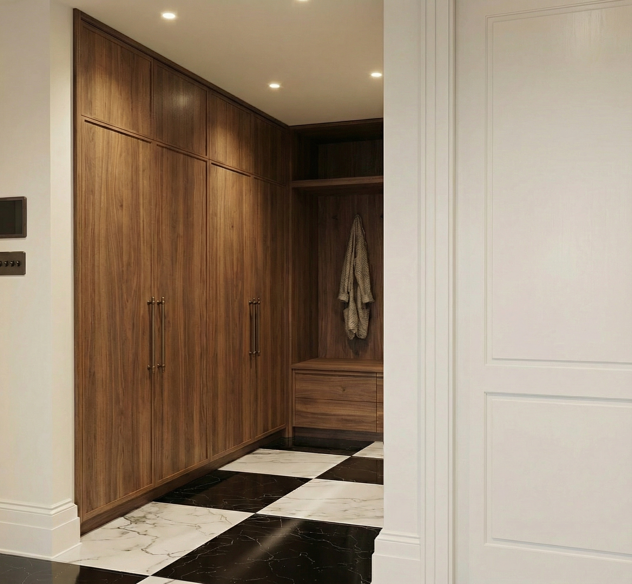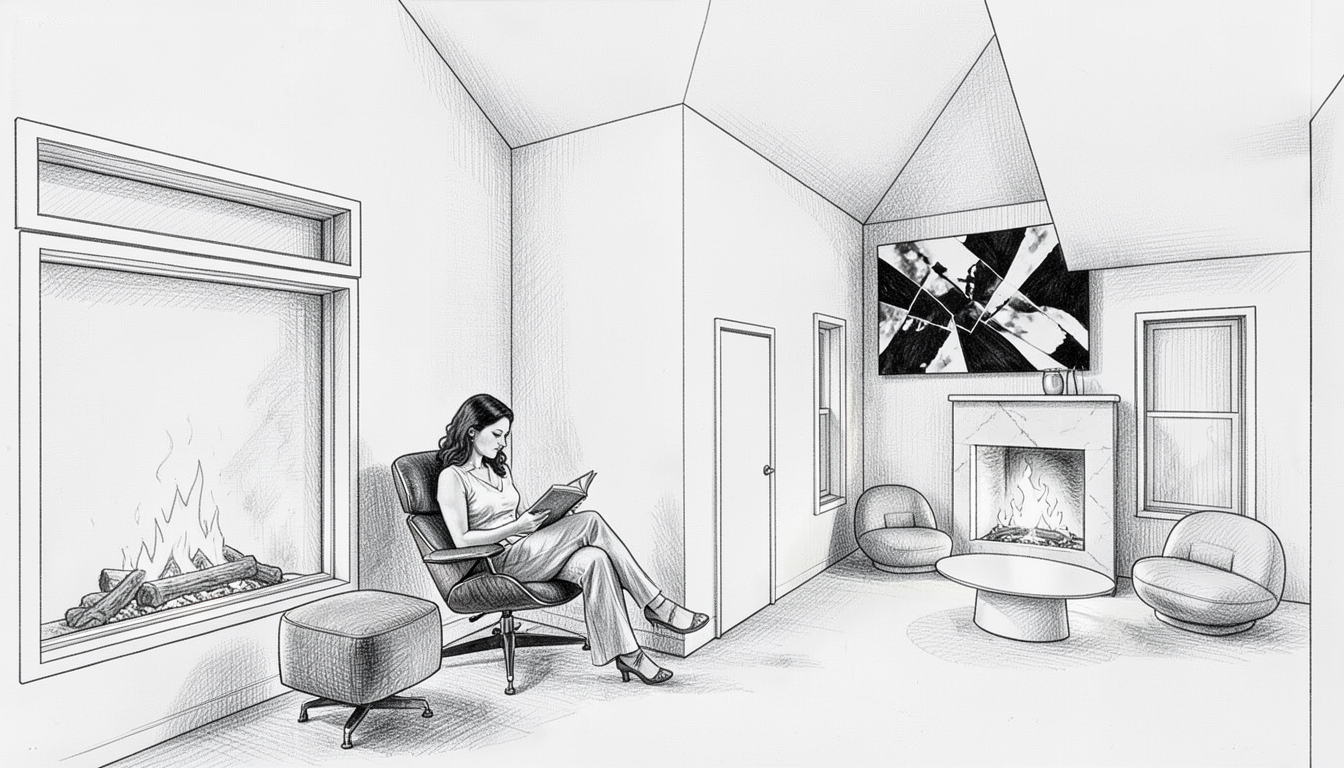 black and white pen sketch on white paper add a lady sitting in an eames chair reading a book fire in the fireplace vase of flowers above the fireplace all black and white no color view of the street through the big window on the left and the small window on the right with neighbors outside walking a dog
