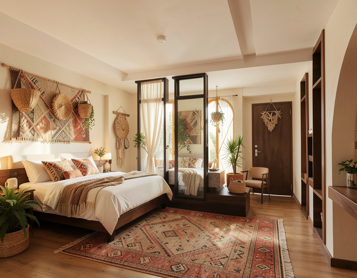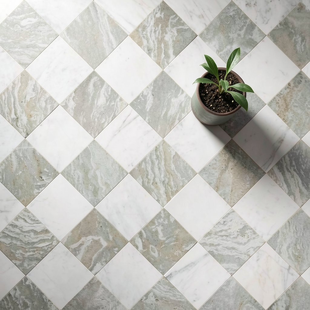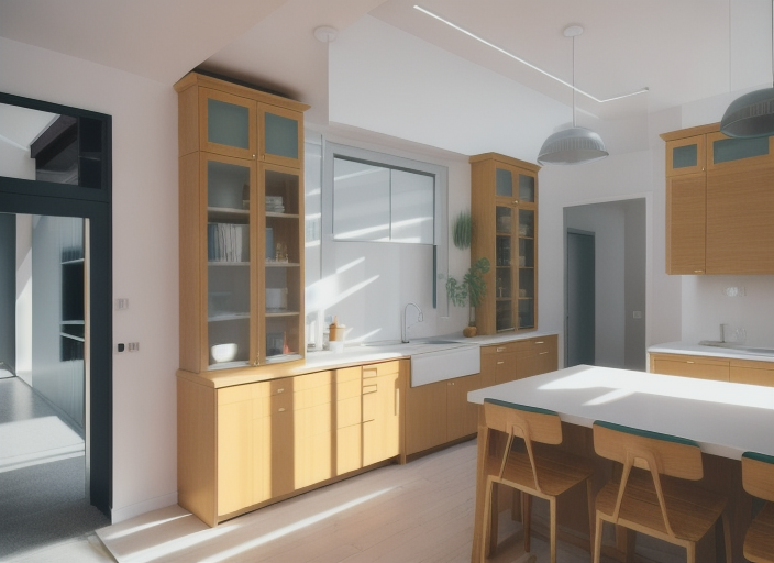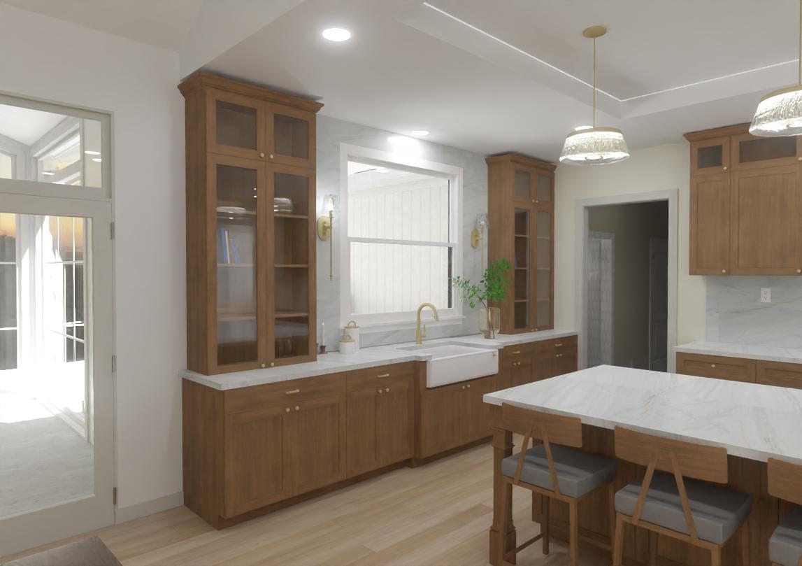 render a stunning kitchen interior with a warm and inviting atmosphere incorporate rich dark wood cabinets and light tan wooden flooring use a sleek marble countertop with subtle grey veins for the surfaces the walls should be a soft creamy white to enhance the natural light from large windows add gold fixtures and fittings throughout including the faucet and handles place a vibrant green plant near the window for a touch of nature ensure soft diffused lighting from elegant pendant lights above the island creating a cozy and sophisticated ambiance