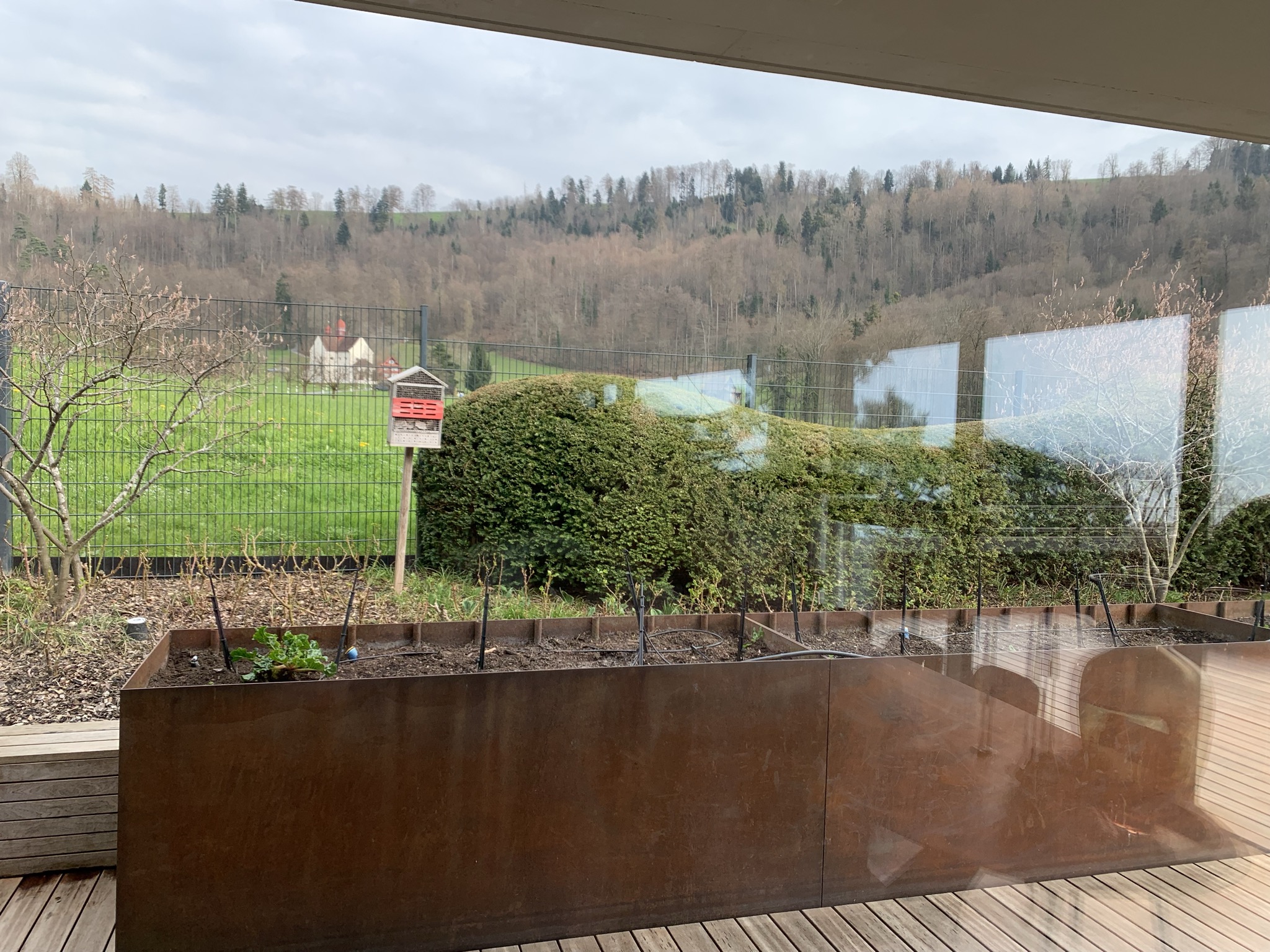 exterior shot das gew chshaus mit einem sockel aus klinkersteinen waagrecht gemauert soll in die aktuelle situation eingepasst werden skizzenstil in tusche k nstlerischh l ssig umgesetzt