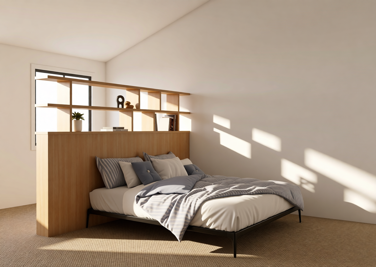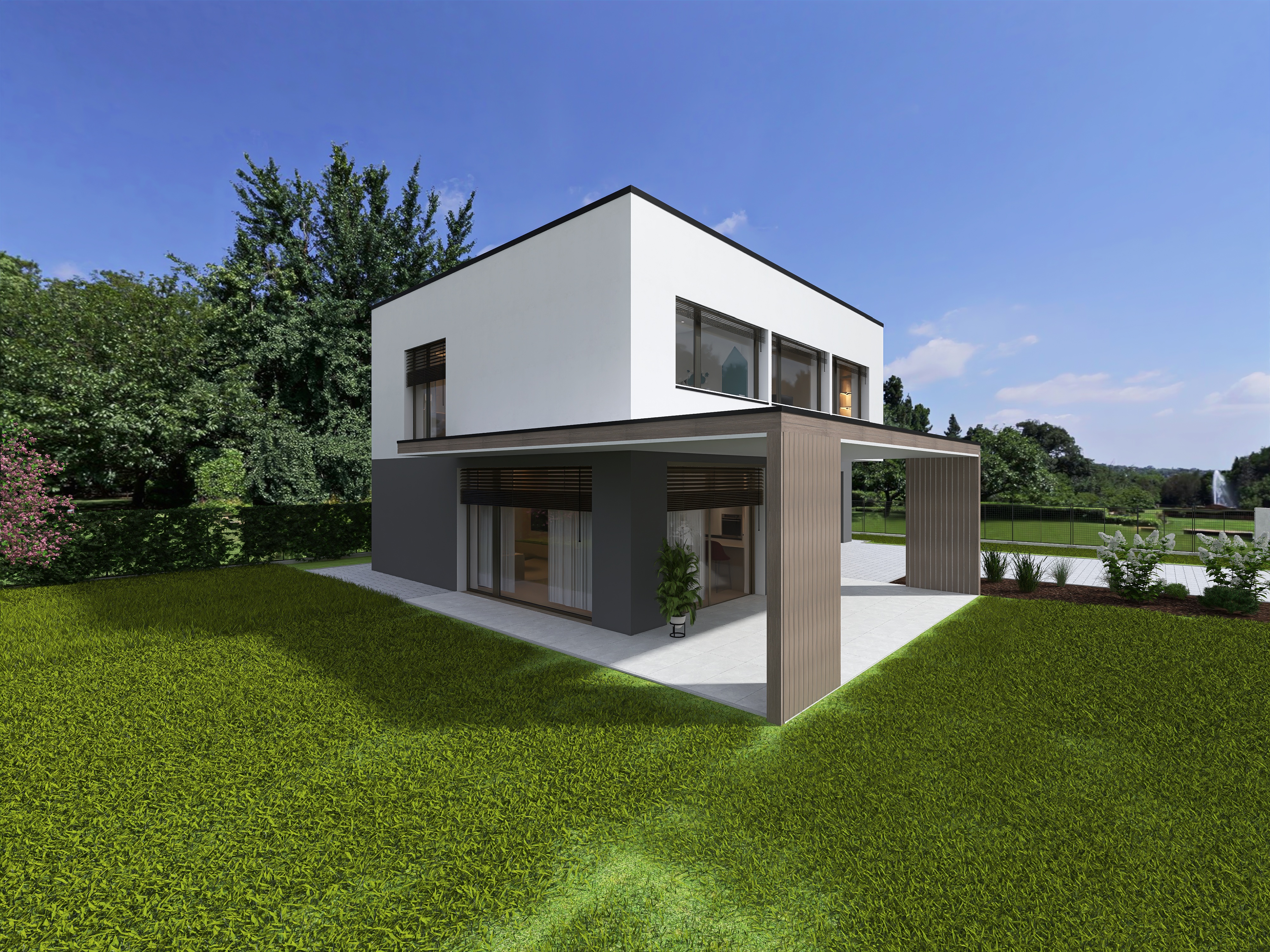 render a photorealistic 3d perspective of this house reference the current material style just enhance them light bronze decor in doors windows and garage doors cold wood decor on the sides of pergola white ceiling pergola keep model geometry the same windows doors roof walls garage door pavement driveway do not change the view only enhance the current materials and make the landscape nicer vegetation
