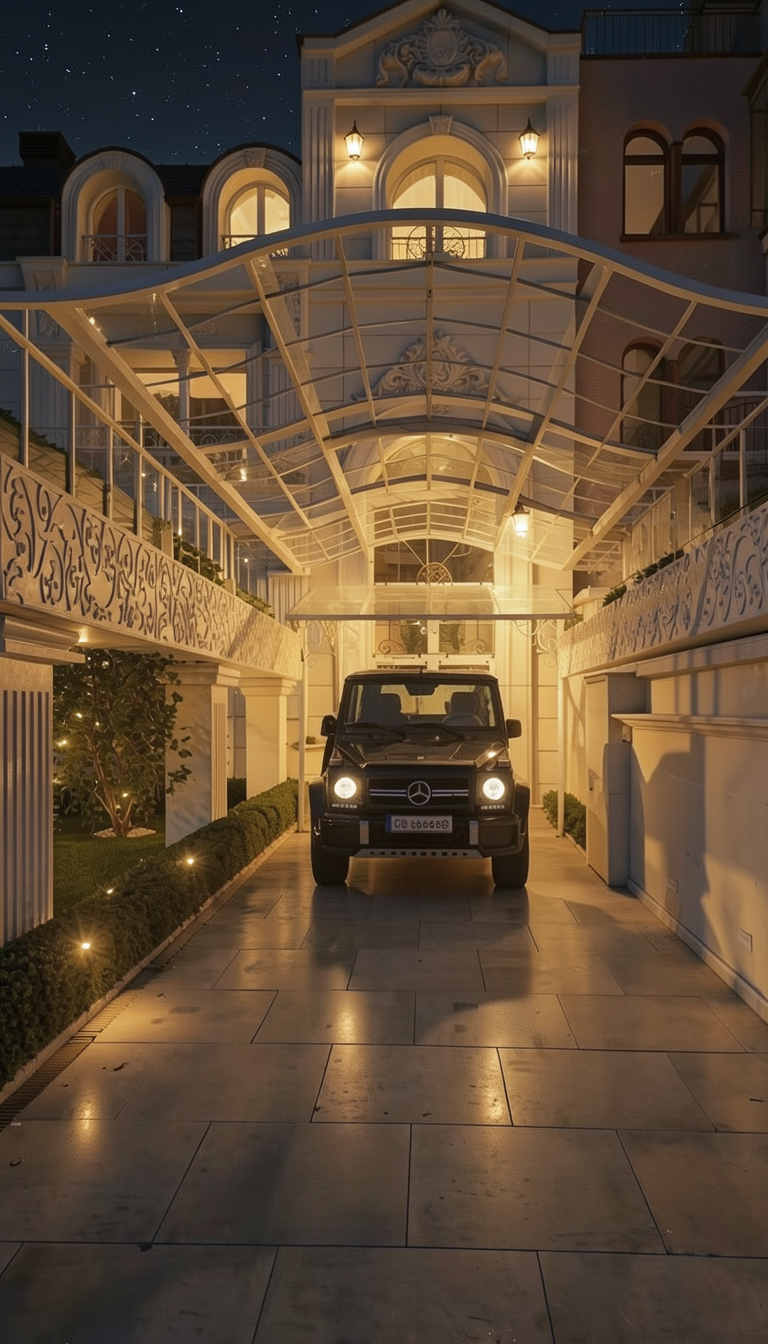 please create realistic rendering with realistic materials realistic landscaping with additional landscaping around the home such as small garden beds around the permiter of the home keep driveway as shown keep house as main focus house is all stucco no stone lighting is to bright and direct there is a retaining wall in front of you and you are standing on it not a path