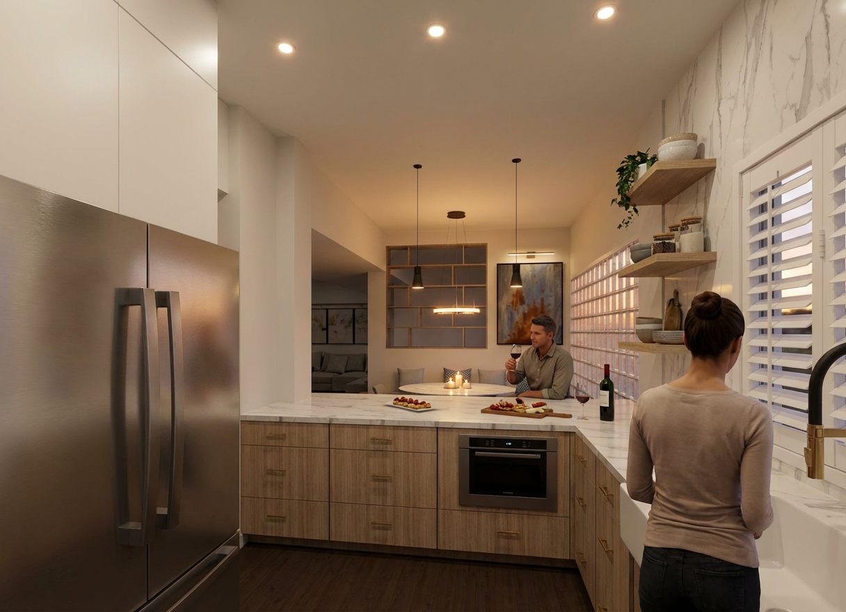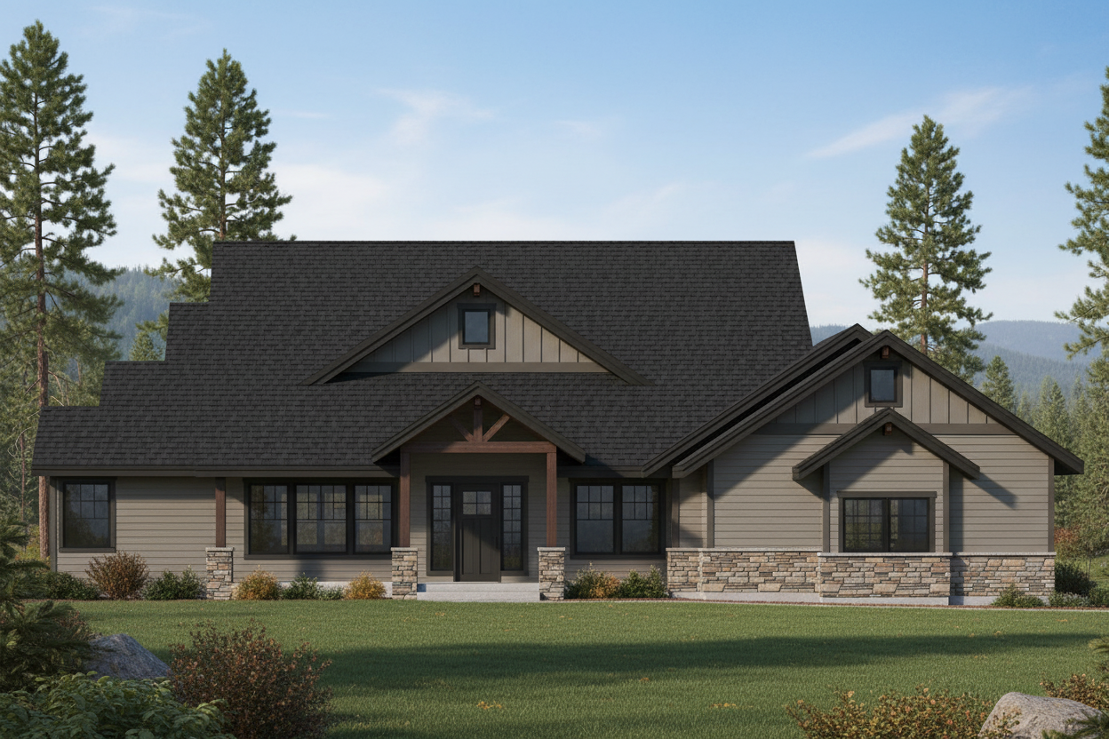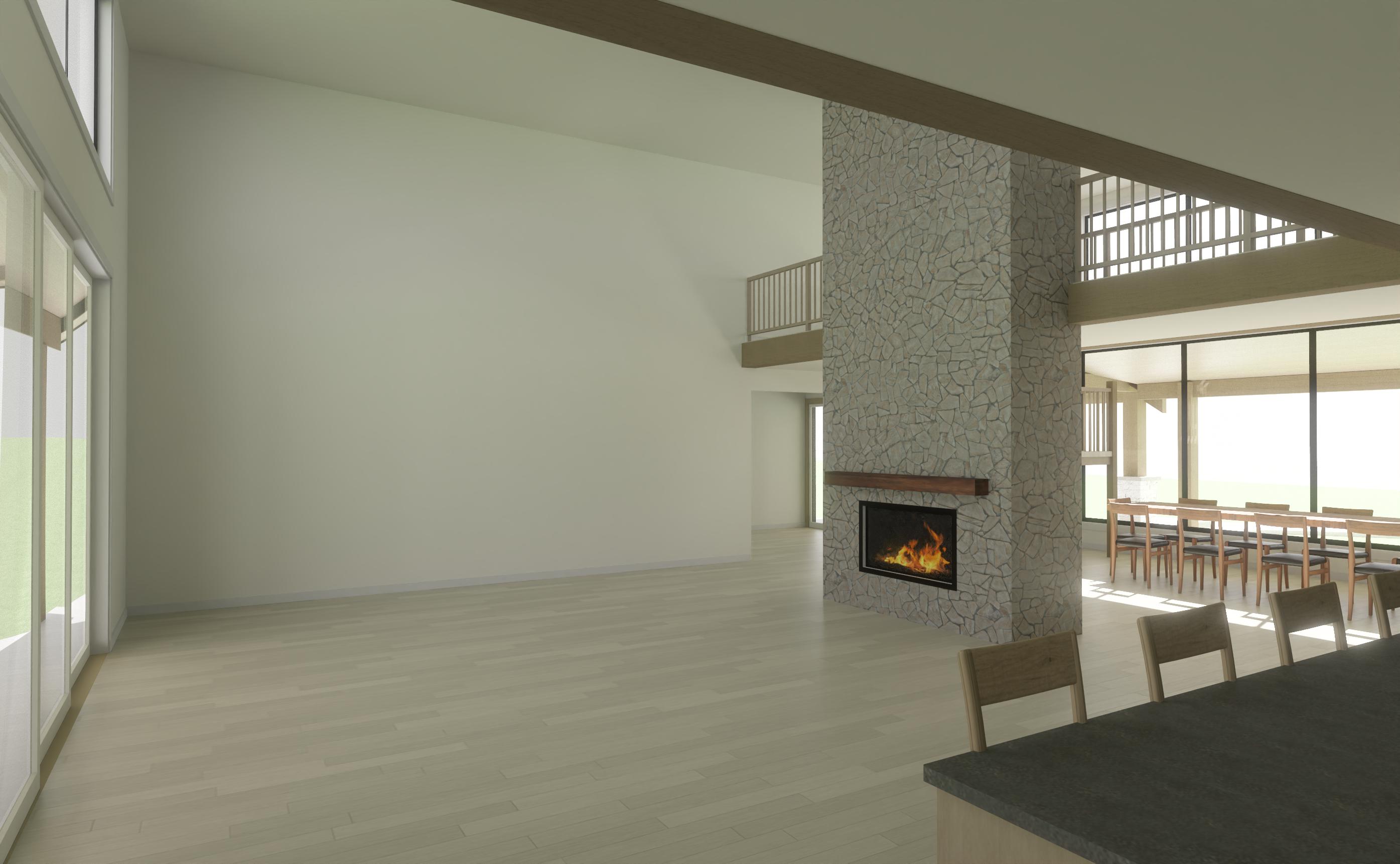 t s important to keep the sizes of everything the same change textures and materials but keep the sizes of everything the same make rock realistic its important to keep to scale this room is big do not change size of windows or doors do not add doors or windows do not change or add fixtures modern warm minimalist interior open living space wide plank white oak flooring soft natural sunlight casting long shadows across floor black steel framed glass partition wall floor to ceiling glass panels with thin mullions neutral color palette creamy white walls light taupe curtains contemporary living room with low profile white sofas warm wood floating shelves with minimal decor plaster fireplace with simple mantle soft ambient lighting large potted indoor tree clean lines high end residential design scandinavian modern aesthetic ultra realistic architectural visualization 8k detail exterior views are western montana add hearth to fireplace furniture should be close to camera the camera is in the corner and there is a couch there add living room furniture add a rug place large art piece on wall remember to not change the scale its very important to keep the sizes the same