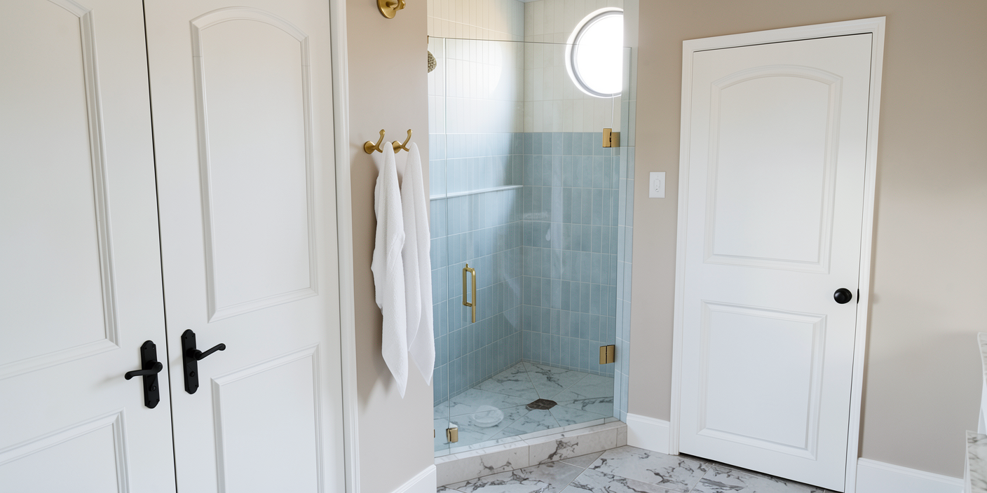 narrow elongated bathroom interior scandi australian minimal style smooth warm white lime washed plaster walls large flush skylight bathing the room in even diffused daylight large format matte stone look porcelain floor tiles in warm greige open borderless walk in shower with linear drain slim floating oak timber vanity with white undermount basin brushed brass wall mount tap simple frameless rectangular mirror with warm led backlight strip natural linen hand towels terracotta pot with a single leafy plant no clutter calm and functional soft warm neutral palette architectural photography 8k photorealistic render