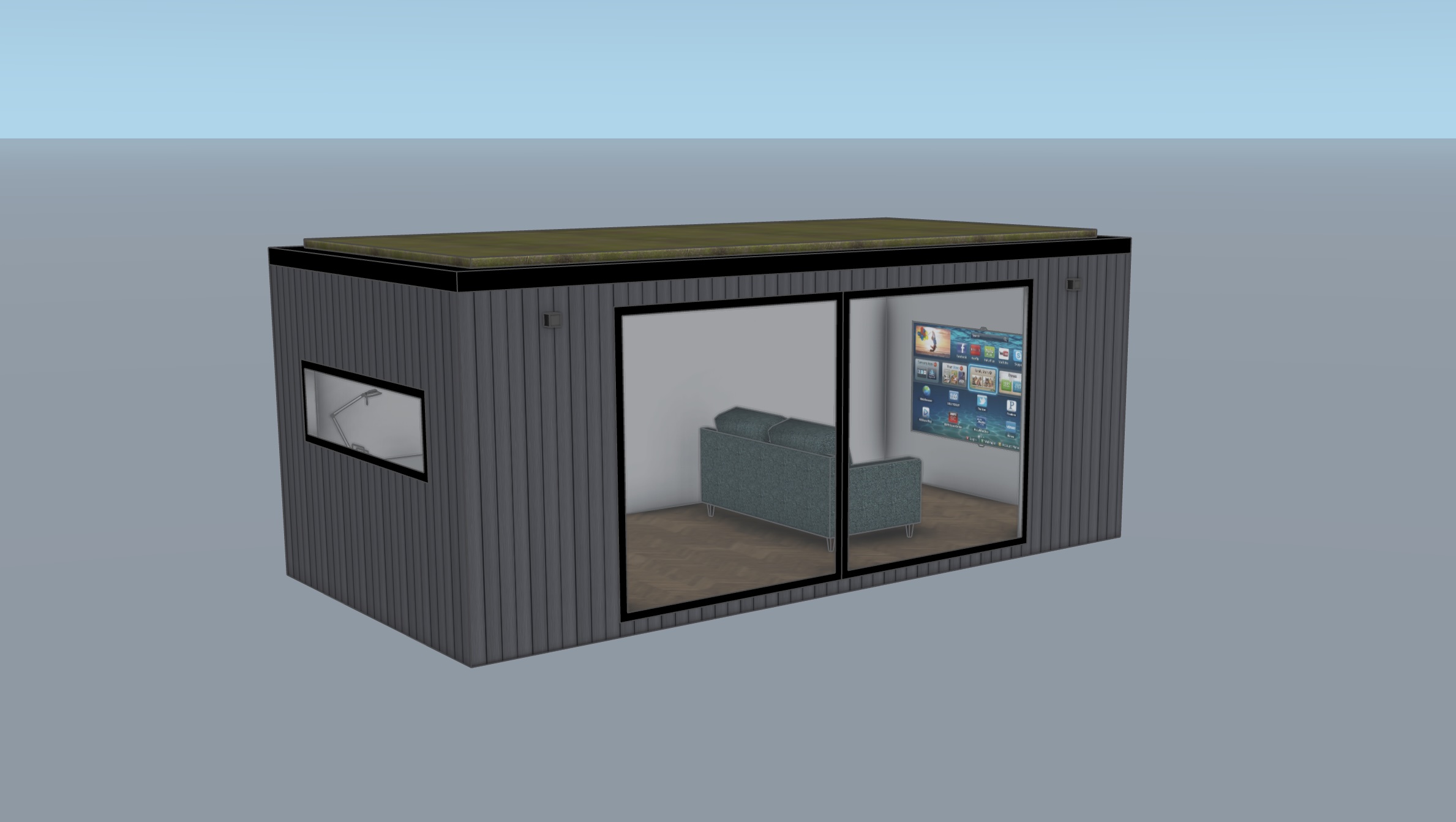 place this modern garden room office with sedam roof in a modern garden the exterior cladding is black vertical