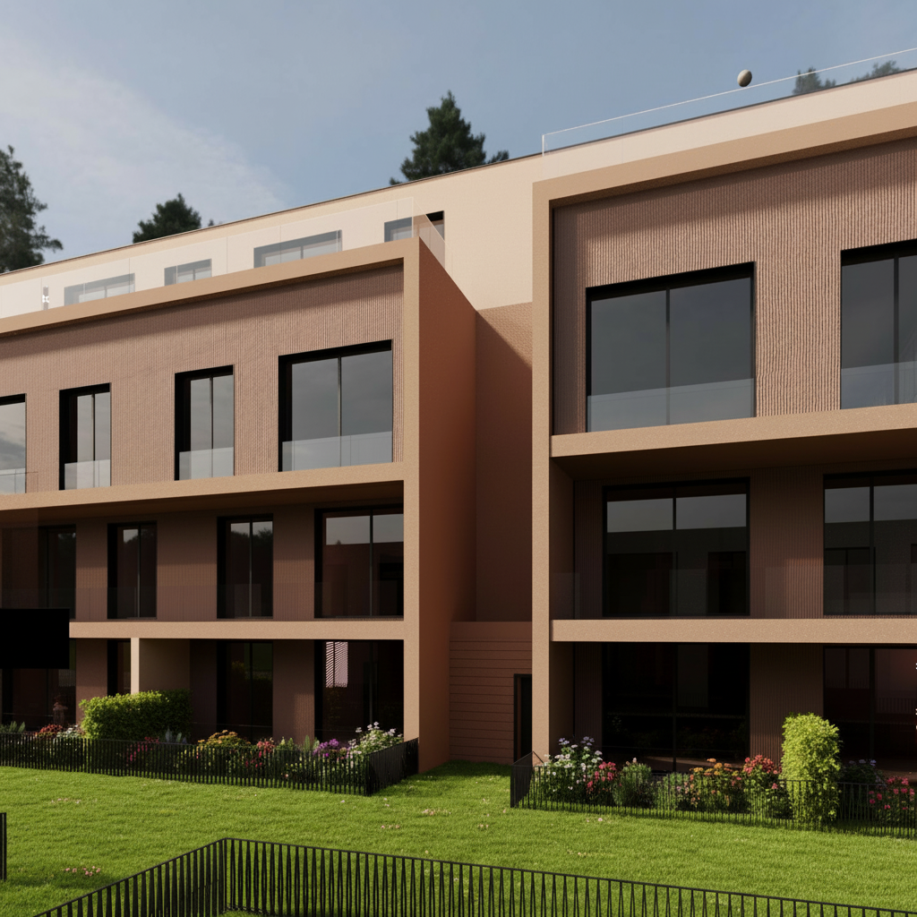 green grass and every apartments garden are separated with rails in the middle is car road