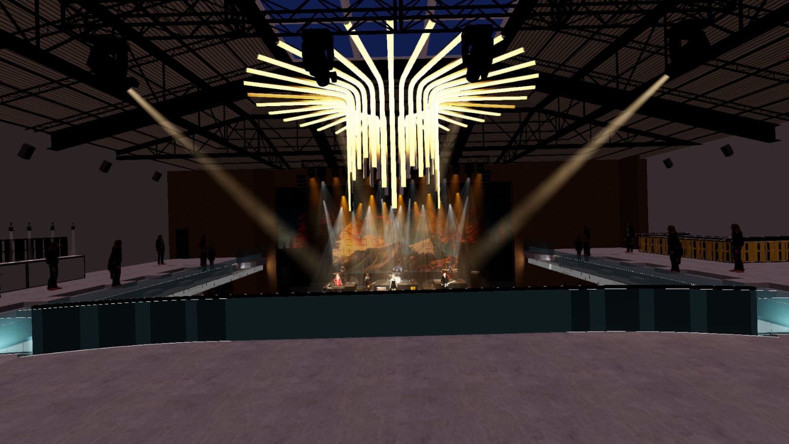 zaha hadid interior shot interior concert venue at night preserve the overall venue geometry and proportions exactly as shown in the supplied images maintain the high ceiling exposed roof structure truss layout balcony forms stage width and audience floor layout do not alter architectural massing or room shape the main audience area is a large sunken floor that sits below the surrounding perimeter levels preserve this vertical section perimeter walkways and second floor balconies remain elevated and continuous on both sides do not flatten or compress the elevation change a large sculptural ceiling lighting feature hangs above the center of the room it is composed of layered curved linear light elements forming a radial chandelier like canopy this element is permanent architectural lighting preserve its position scale symmetry and relationship to the stage and sunken floor exposed steel trusses and rigging remain visible above and around the sculptural lighting feature maintain the industrial ceiling language stage lighting is dramatic and warm white and amber beams cut through subtle atmospheric haze lighting originates from overhead truss fixtures and frames the stage and architectural lighting feature without overpowering it the stage remains the visual focus performers are centered and backlit the led wall stays behind the performers as a single unified surface display one clean abstract motion background no text no logos no collage imagery side balconies and perimeter platforms are lightly populated to show tiered occupancy the sunken floor is densely occupied and energetic materials feel premium but industrial dark metal architectural concrete brushed steel and warm accent lighting along balcony edges flooring shows subtle reflections mood is dramatic modern and concert ready nighttime high realism architectural integrity preserved architecture