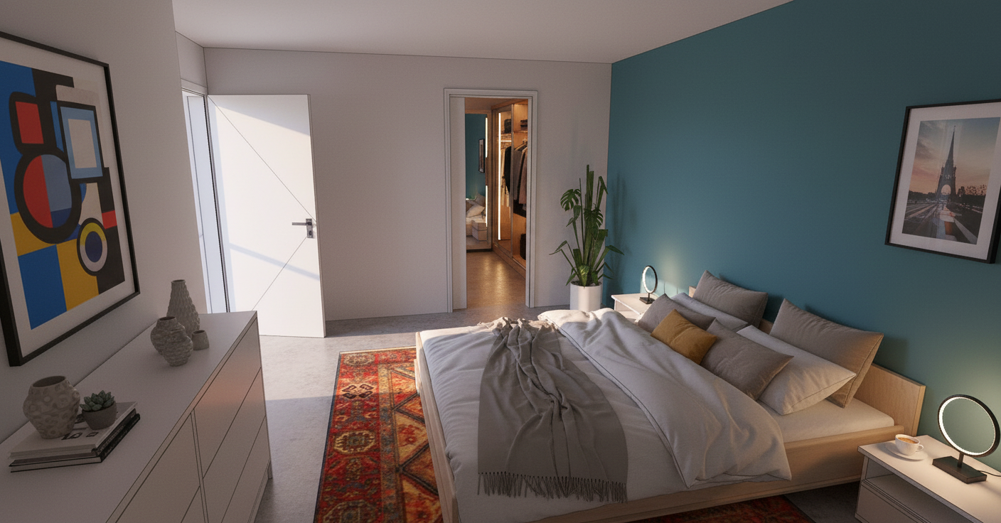 modifie le tapi plus moderne remplace le sol par du parquet et ajoute une lampe sobre au plafond