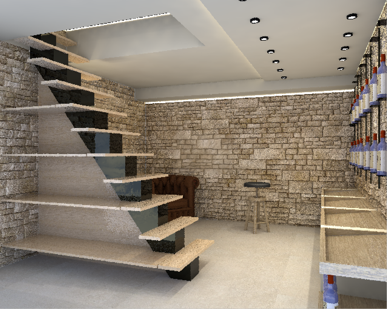 ajoute des caisses de vins sur les tag res sous les escaliers enl ves les bouteilles qui sont sur les escalier