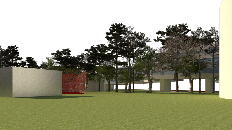 make the mesh of the paddle tennis court more realistic on the left just like the silver cube which is a tennis club restaurant make the building in the background more realistic and add some low vegetation the building on the right is a shopping center also add some people