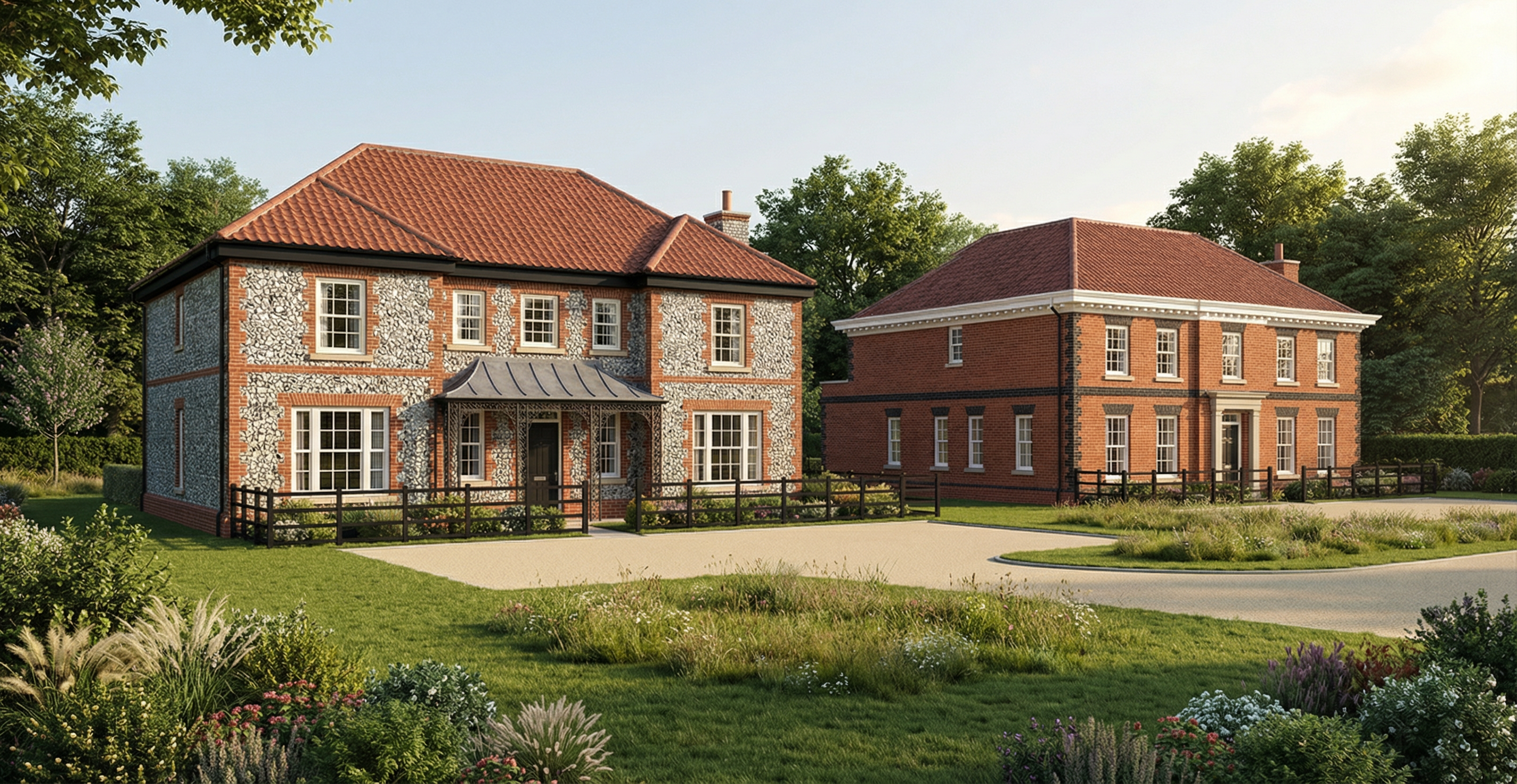 make the fencing black post and rail take away the fence in the right hand of the foreground make all roof tiles flat red clay tiles add a tesla to the front driveway