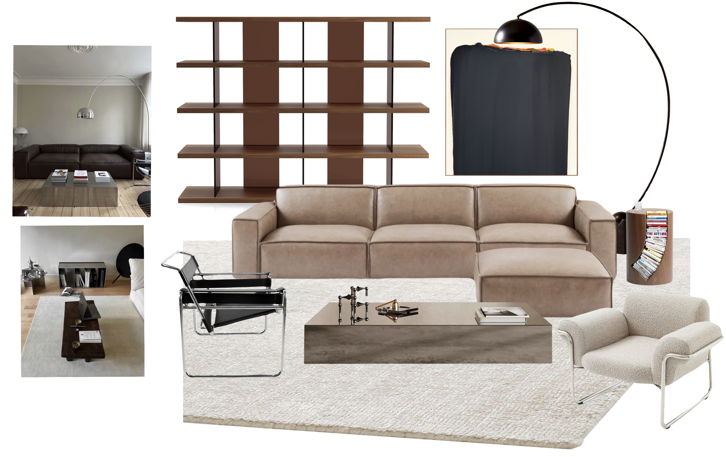 modern living room in an apartment highrise with large floor to ceiling windows with two black leather chairs