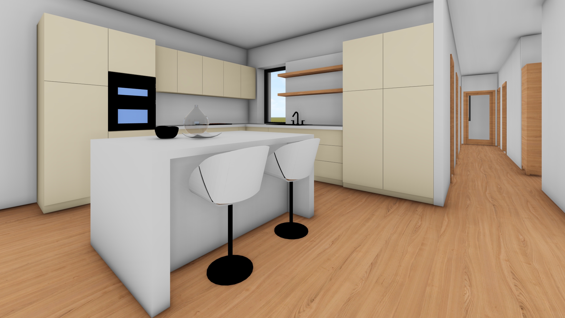professional architectural photography of a luxury minimalist kitchen light oak wood cabinetry with vertical grain seamless handleless design floor to ceiling cabinets large kitchen island with a white marble waterfall countertop and a built in sink stainless steel integrated double oven and fridge warm beige walls light wooden flooring minimalist black track lighting and a thin linear pendant light over the island soft natural daylight high end interior design photorealistic 8k cinematic lighting