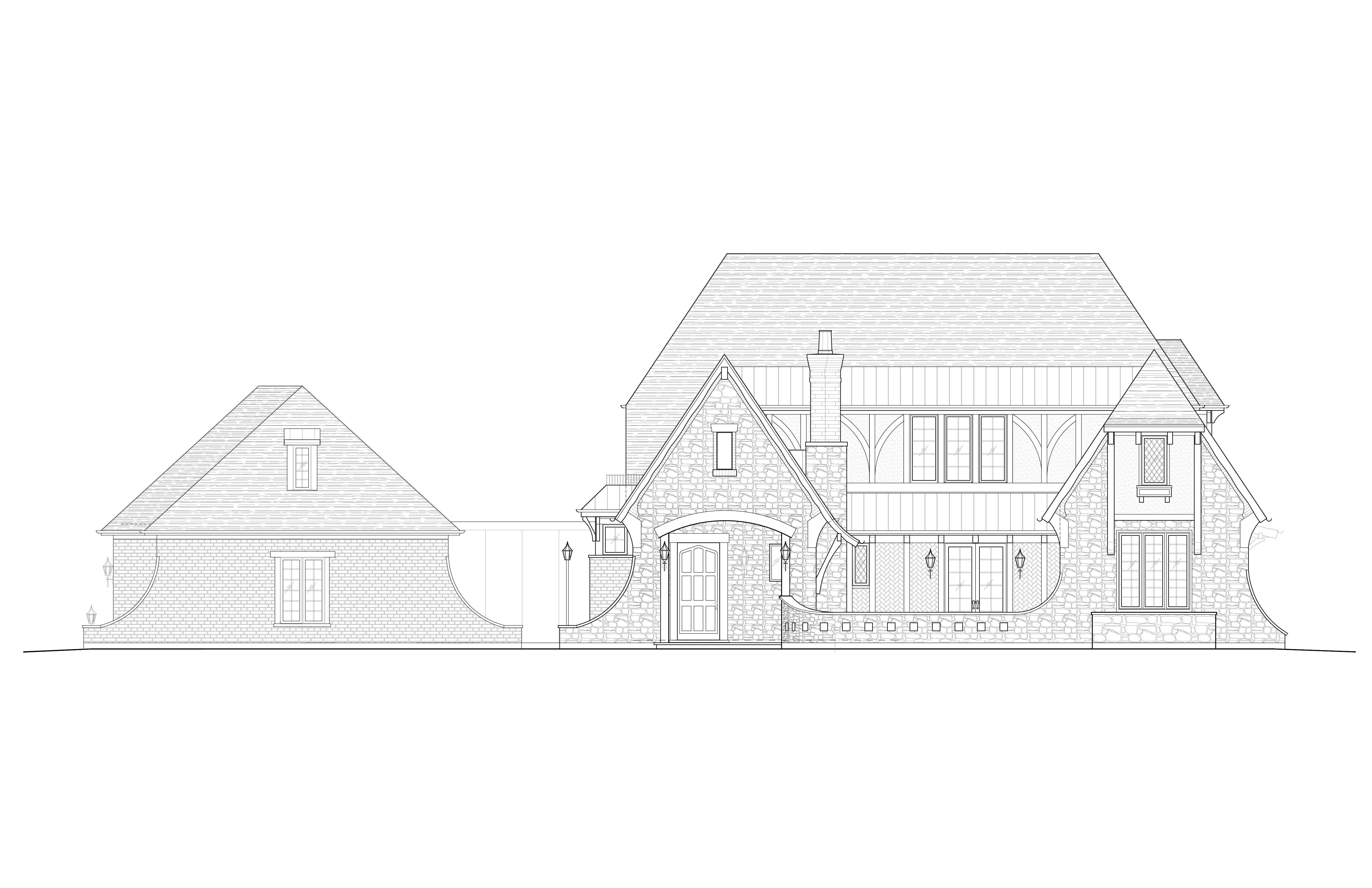tudor revival exterior shot stone front of house brick on the left garage stone caps copper gutters and downspouts copper standing seam metal roofs grey asphalt upper roofs half timbering in dark brown dark brown window clad color lights on dusk add plants and landscaping architecture