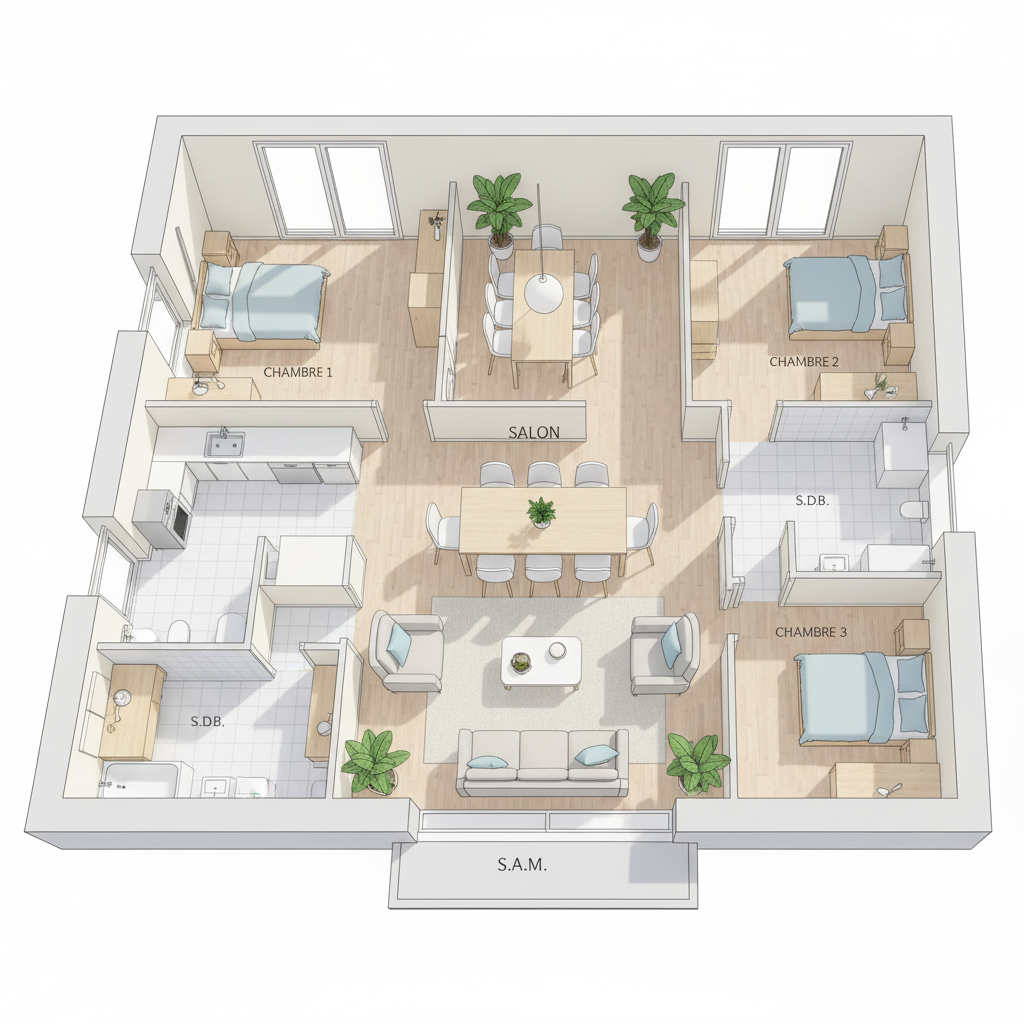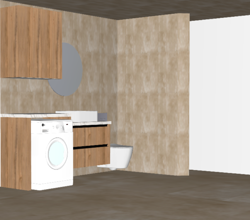 prompt a modern bathroom interior with a minimalist design the walls are textured with a soft beige color providing warmth and elegance the wooden cabinets have a natural oak finish adding a touch of nature and sophistication the washing machine and sink are a crisp clean white offering a sense of freshness and modernity a round matte grey mirror above the sink adds a contemporary accent the floor is designed with a muted brown to complement the walls enhancing the earthy feel the atmosphere is serene and inviting with natural light softly illuminating the space for a calm and refreshing ambiance