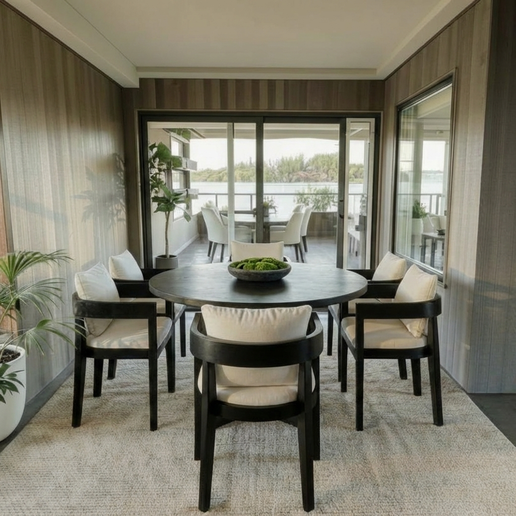 remove 2 of the arm chairs the dining table should have only 4 chairs evenly surrounding it do not change or reinterpret anything else in this space
