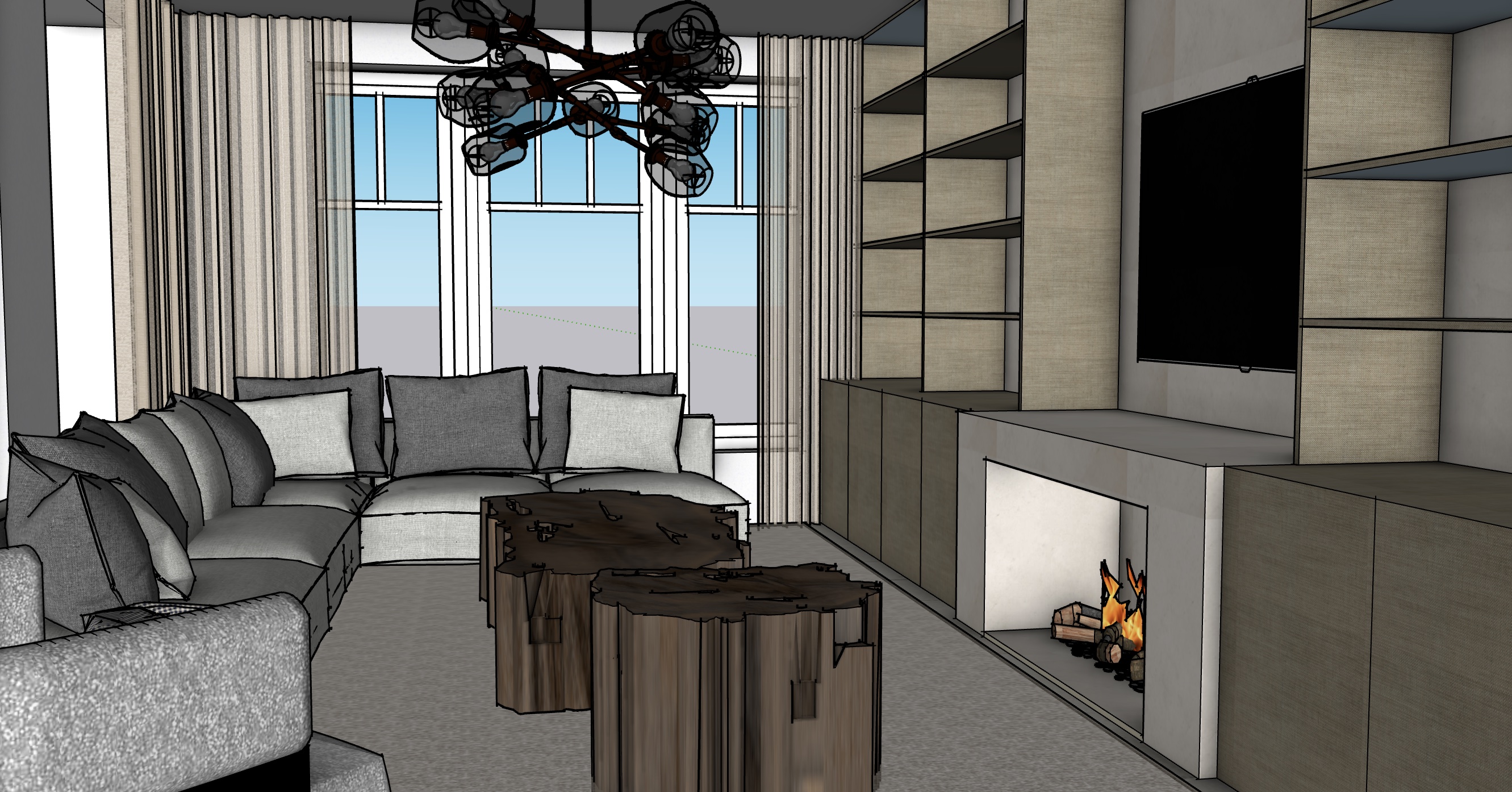 contemporary interior shot farmhouse style living room with library linen and wood petrified wood coffee tables architecture