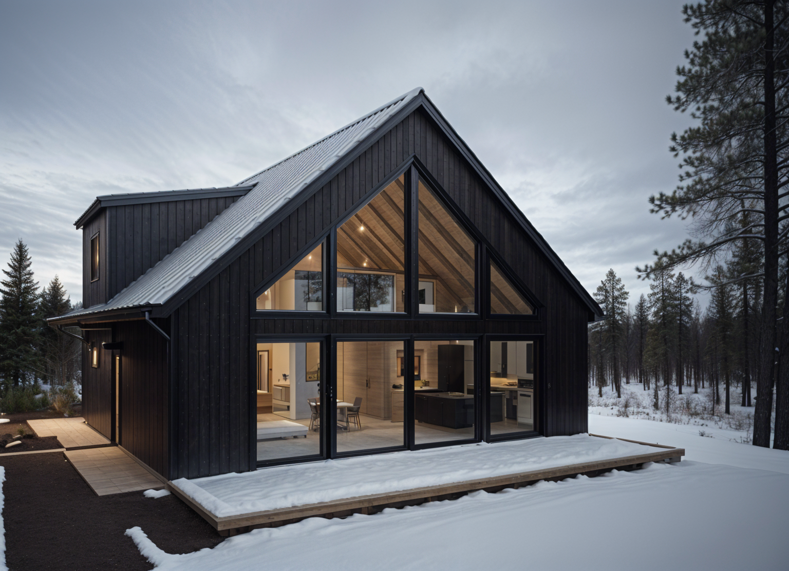 nordic exterior shot lighter wood siding black metal roof with no soffit overhang black rain gutter trees behind architecture