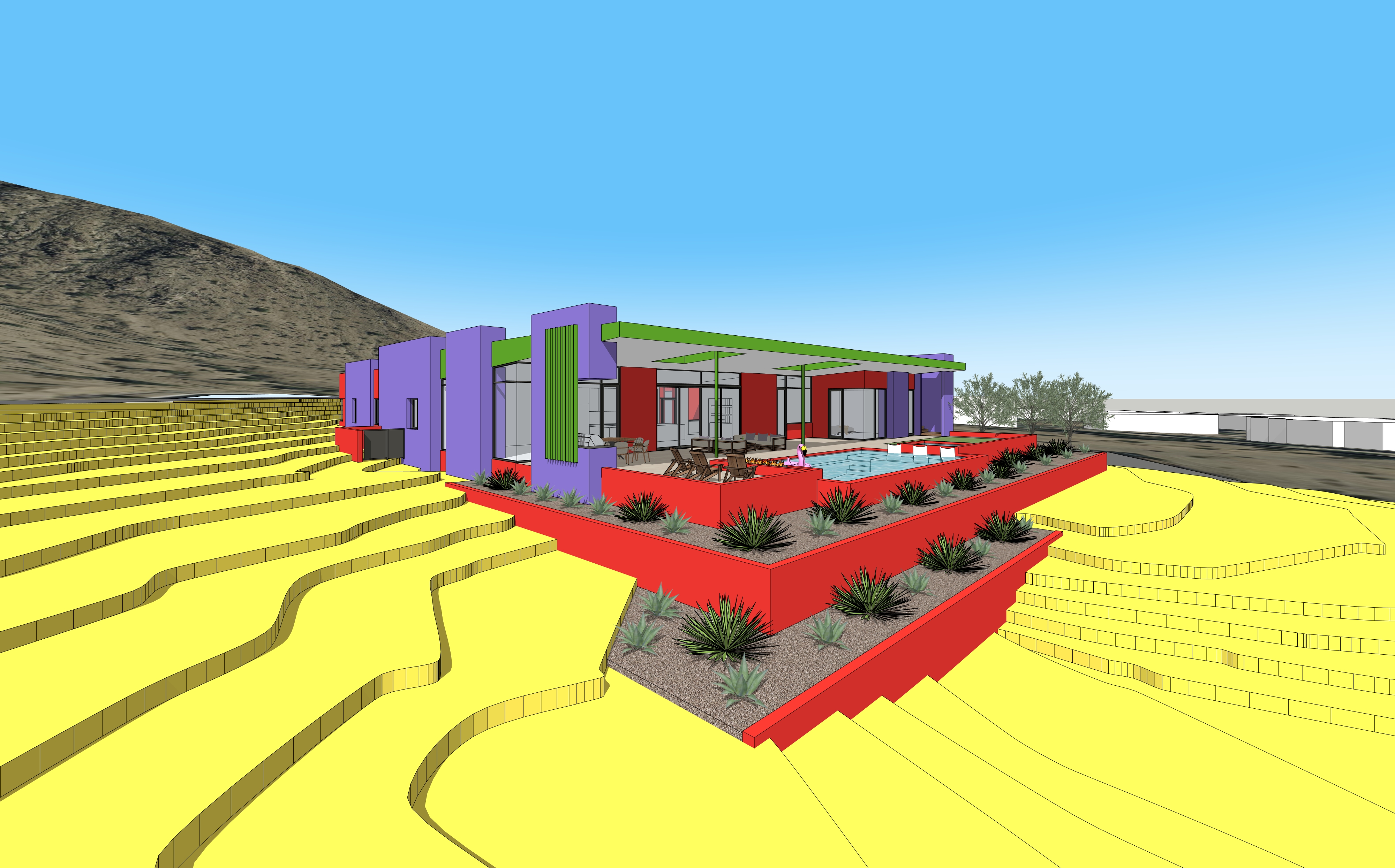 create a hyper real rendering where the red walls are 12x24 limestone pavers that are also used on the exterior deck the purple walls are desert table mesa rock with a random arrangement all of the green fascia and fins are buckskin sr 0 38 e 0 86 sri 41 from southwest metal make all the yellow blend into a smoothly contoured desert landscape with random mesquite desert brush and saguaro in two places make the landscape shown in the planters are organized arrangements of large aloes barrell cactus and some ocotillo