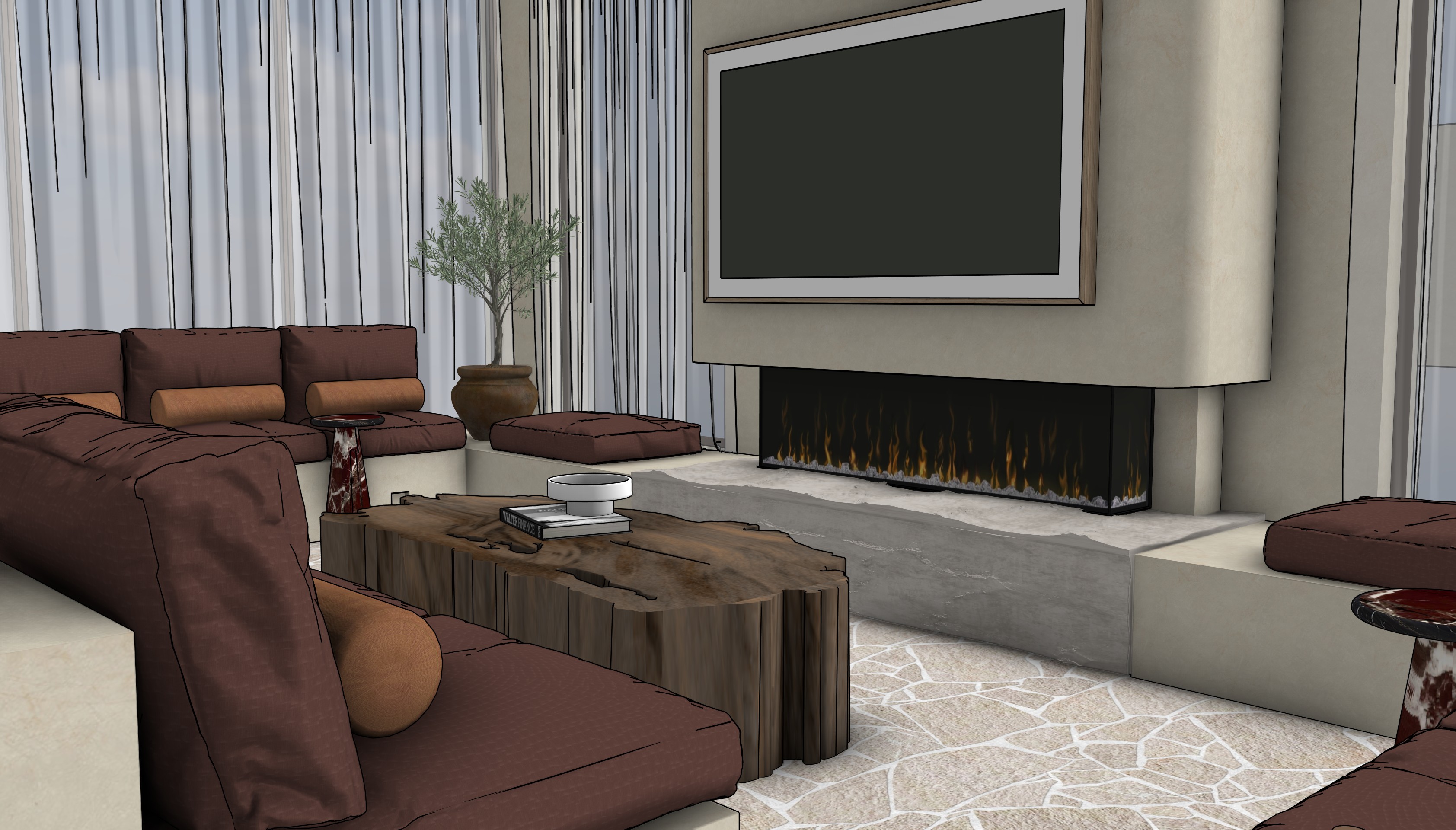 bolster cushions are a muted orange velvet