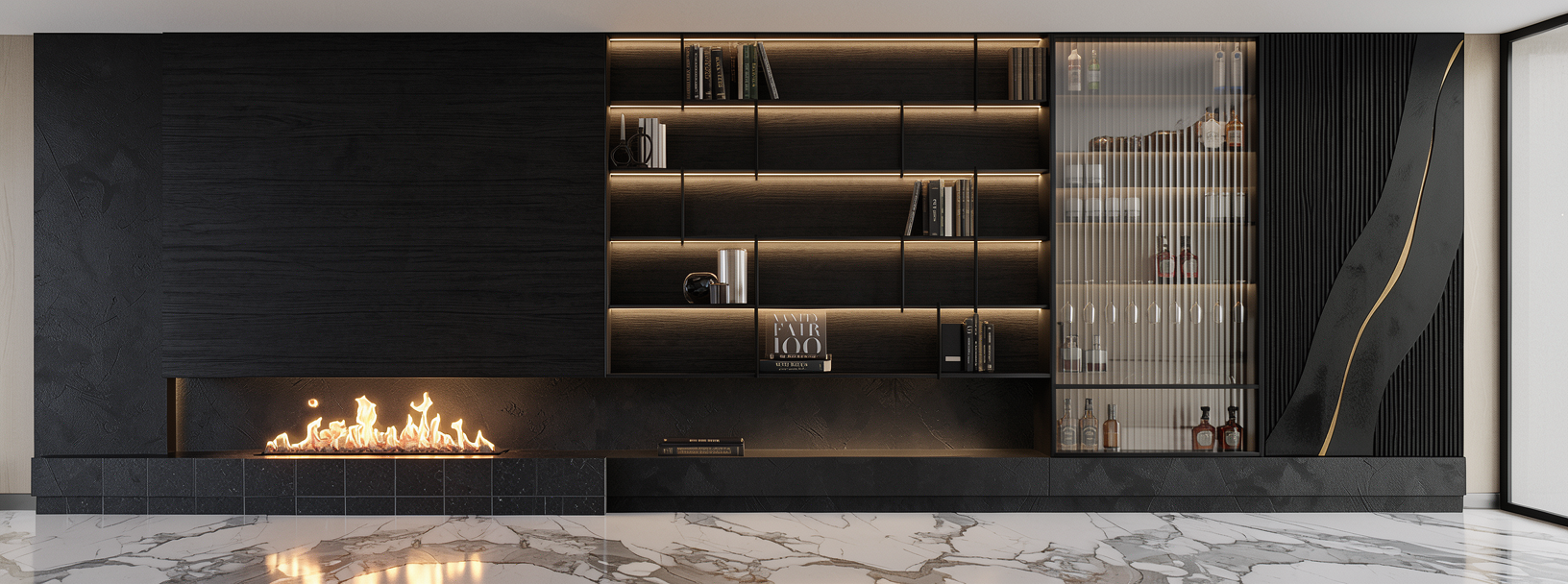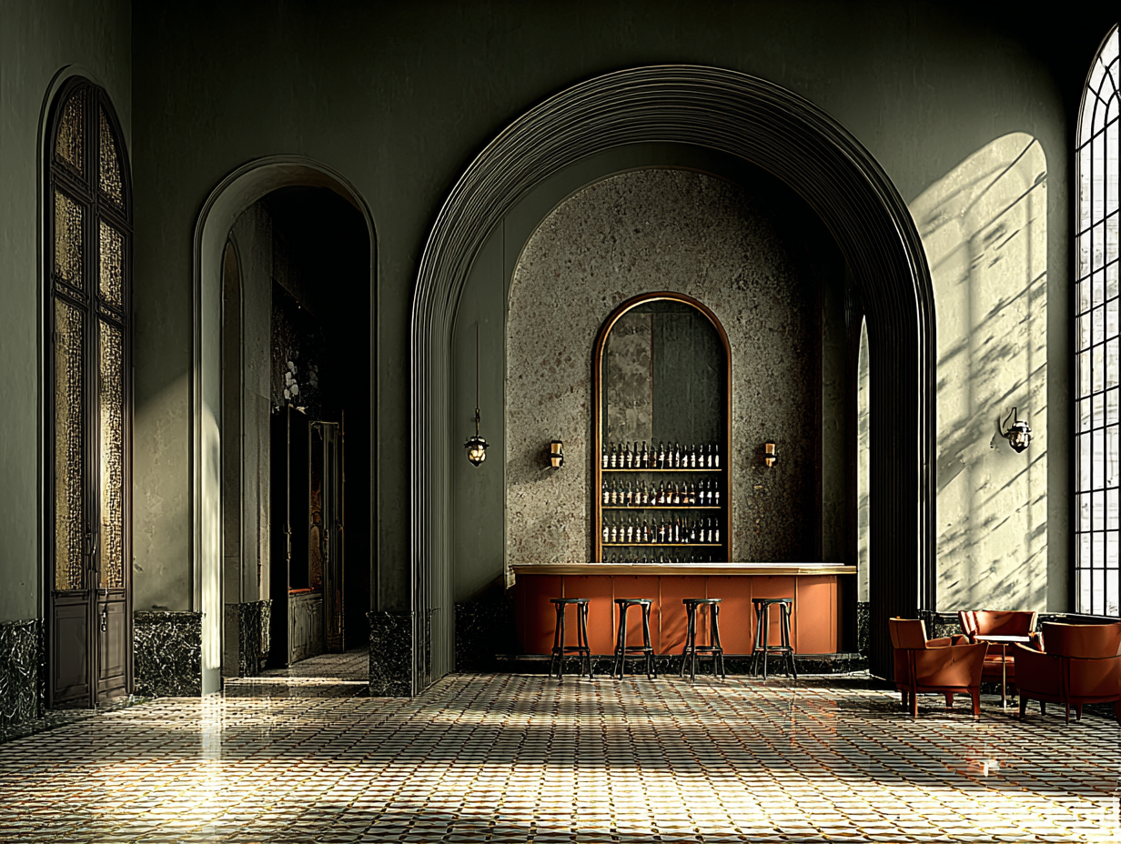 rustic elegant bar interior featuring a large stone archway framing the bar area use grey granite for the walls creating a luxurious backdrop the bar is styled in warm brown wood with a glossy finish and the bar stools have rich leather seats in a deep warm brown include a checkered floor with alternating white and maroon tiles adding a classic touch soft golden lighting fixtures cast a warm inviting glow enhancing the atmosphere incorporate muted olive green doors and paneling blending with the sophisticated ambiance the overall atmosphere is warm elegant and inviting with a touch of vintage charm