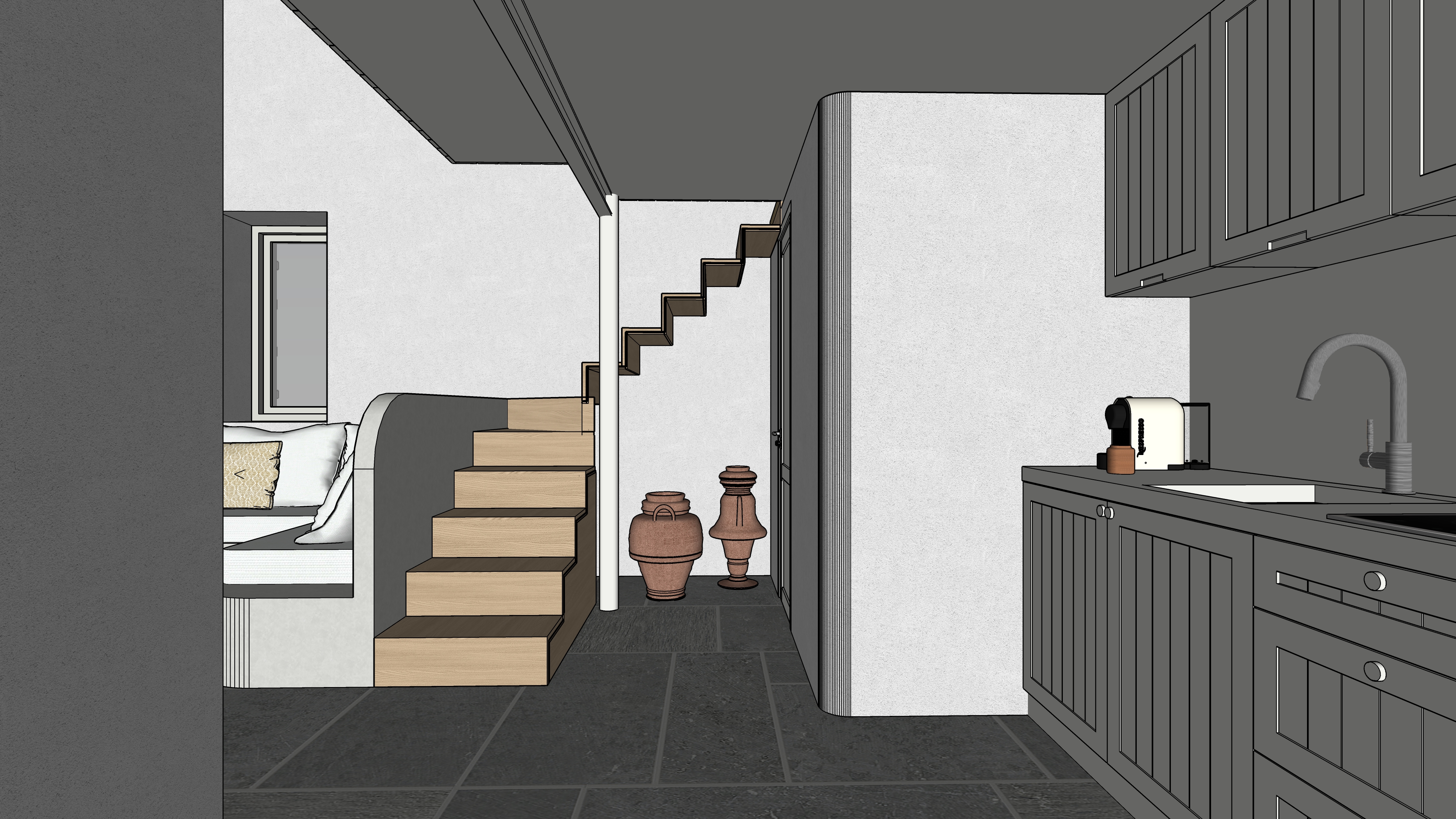 main prompt this is a cycladic house in kythnos the floor is natural gray pelion stone the sofa is white cement paint the sofa fabrics are light cream there is wooden stair leading to the mezzanine which is made of metal in white color and light oak wood the kitchen cabinets are white the countertop is white quartz there is natural light negative prompt do not change geometry do not add objects do no change colors or materials