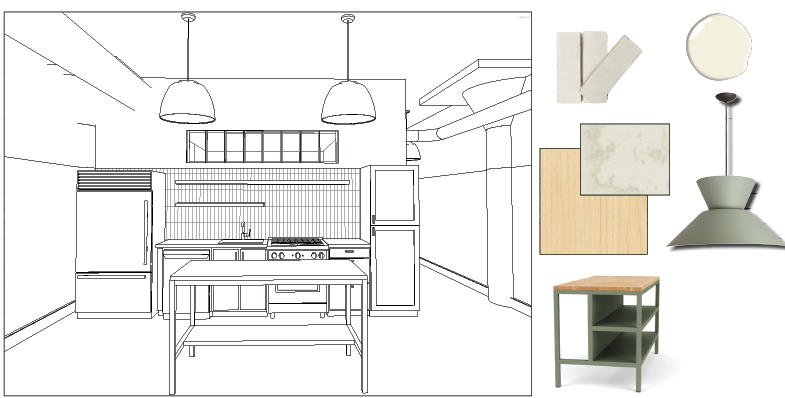 modern warm residential loft kitchen polished concrete floors white walls and white concrete ceilings are painted smooth creamy white like the paint chip in the photo 2x6 glossy off white tile backsplash vertically stacked floating shelves on backsplash wall are light oak kitchen cabinets are a light natural maple like the sample in the photo white marble countertops on back kitchen counter like the sample in the photo base of island counter in foreground painted sage green counter on island is a rich darker maple butcherblock sage green metal pendants like the light fixture in the photo use a combination of soft interior lighting and exterior golden hour daylight do not change any building geometry do not change architectural elements do not change windows or doors keep camera view and angle the same do not add any decor not shown in reference image