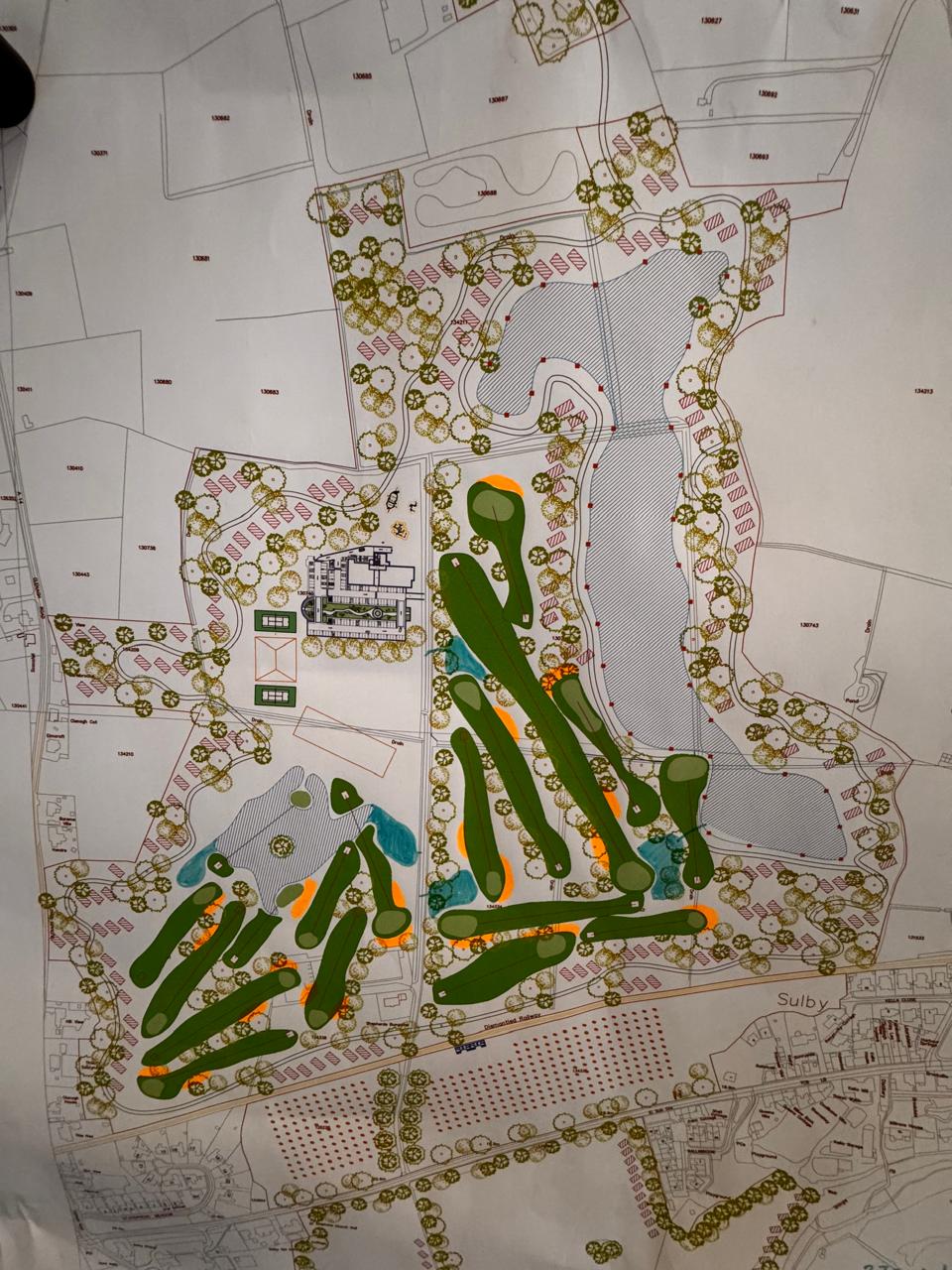 turn golf course plan in to sketch image make sure to incorporate the lake areas pink blocks are holiday lodges apply light green background to the plan