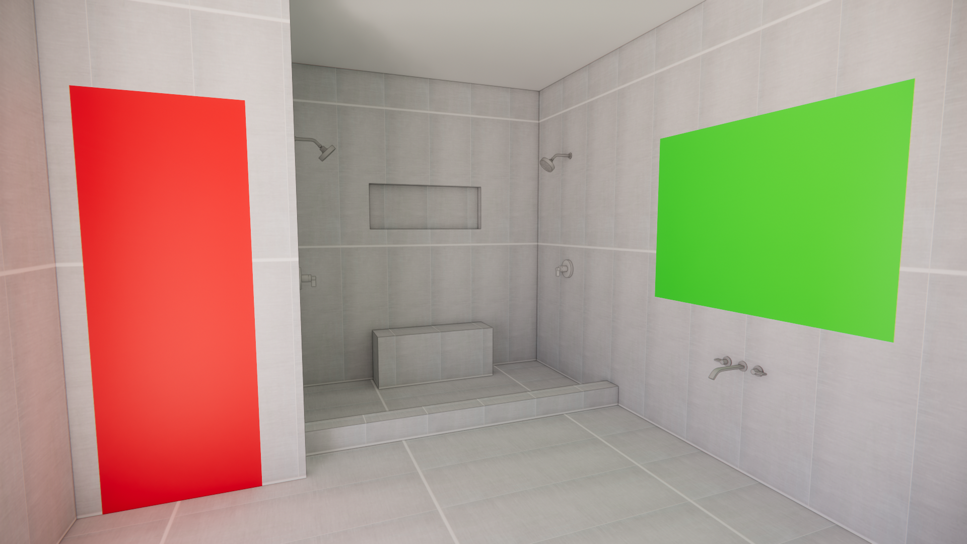keep everything else the same materials or texture just add where it is highlighted red a modern flush mounted pannel door in white ad what s highlighted green is a window make a white modern window with molding and outside the window juts put trees