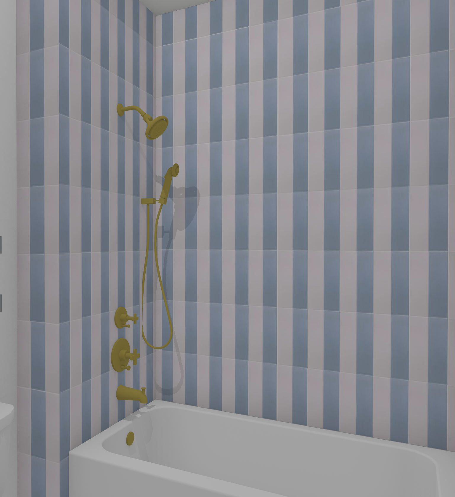 make this rendering look like a real photograph it is mid day there are no windows in the room door is behind camera plumbing is satin brass