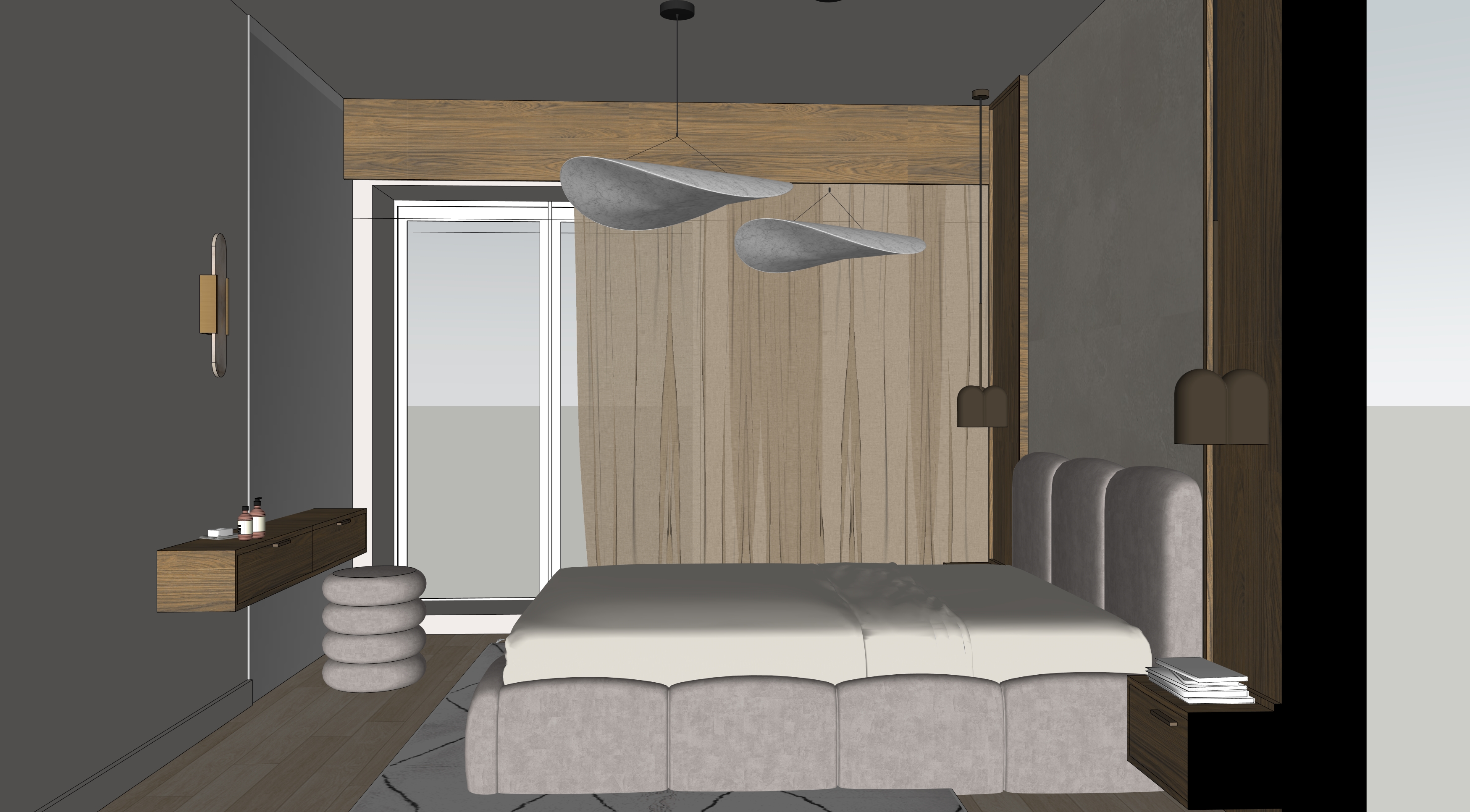 do not change layout proportions furniture placement materials or colors apply high end hyper realistic lighting with soft natural daylight entering from the window behind the bed create a warm minimal contemporary bedroom interior with aromas del campo oket 3 pendant lamp in brushed brass new works tense pendant lamps suspended above the bed soft sculptural white tyvek shade lightweight organic floating form behind the floating vanity cabinet on the left wall a full height wall mounted mirror glued directly to the wall covering the entire height of the room clean edges no visible frame soft diffused daylight overcast scandinavian mood realistic mirror reflections with subtle depth and accurate light bounce realistic global illumination and soft shadows ultra detailed fabric textures on upholstered bed light beige boucle subtle oak wood grain detail on vertical panels behind the bed matte dark grey walls with micro texture soft shadow gradients on ceiling realistic glass reflection in window slightly warm color temperature 4200k natural depth of field 35mm lens physically accurate materials no redesign no added decor no styling changes style high end architectural visualization calm refined minimal contemporary european interior resolution 4k ultra sharp cinematic photorealistic