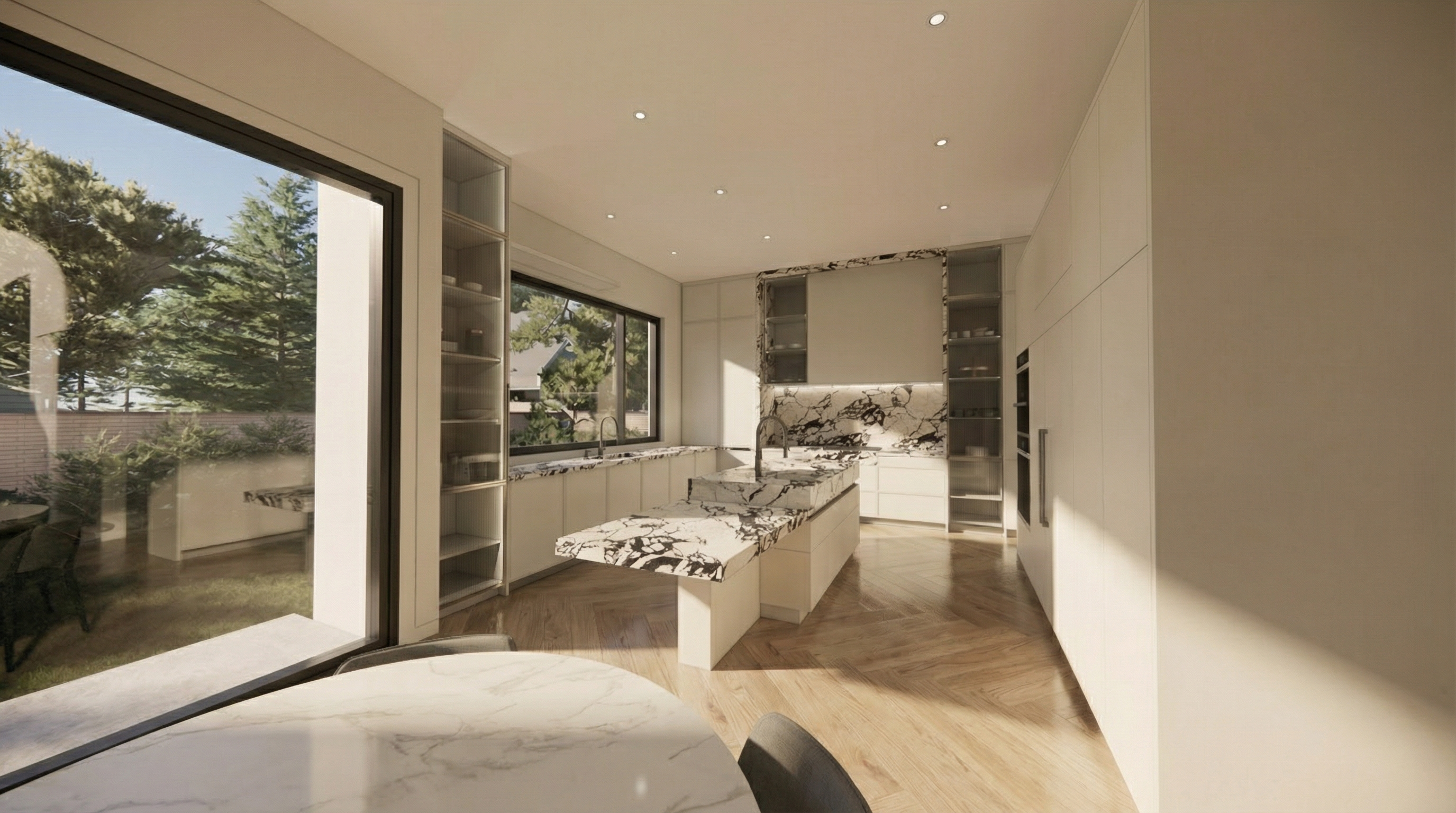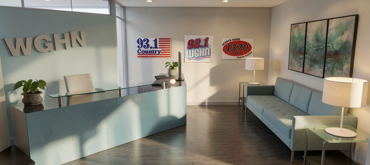 make a photorealistic rendering of this interior office there is not natural light add warm lighting from lamps and ceiling fixtures