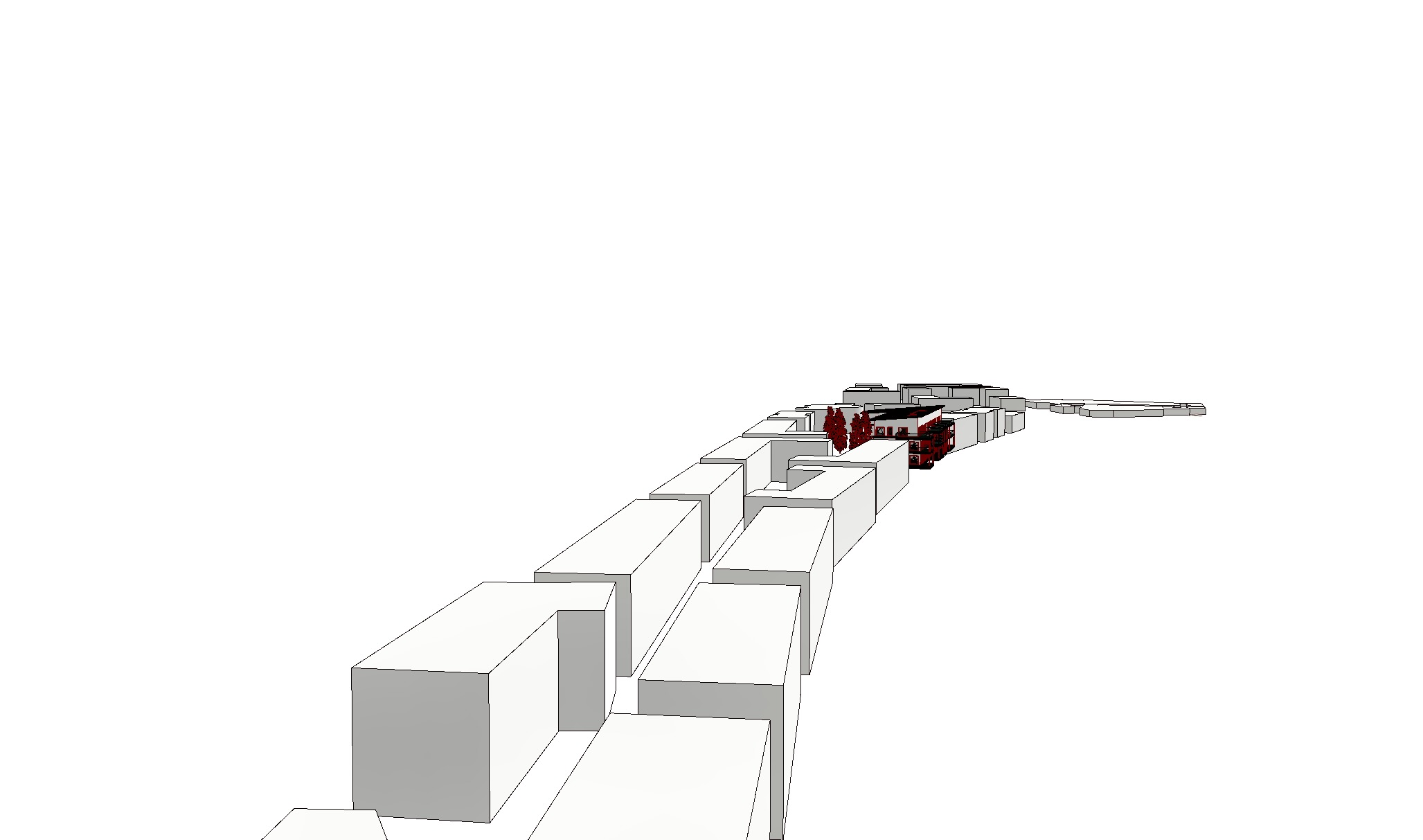 modernist exterior shot use the provided 3d massing model as the exact base do not modify redesign or reinterpret the geometry building typology or urban layout preserve all volumes proportions and alignments exactly as given only enhance the model with realistic architectural details add windows glazing balconies and facade articulation apply subtle realistic materials concrete brick plaster glass keep all surrounding buildings as simple white massing blocks no facade details add realistic vegetation trees small plants and green areas integrated into the urban space use soft natural daylight realistic shadows and a clean architectural visualization style maintain a minimal competition style rendering with focus on clarity and realism no change in camera perspective no additional buildings no alteration of the design architecture