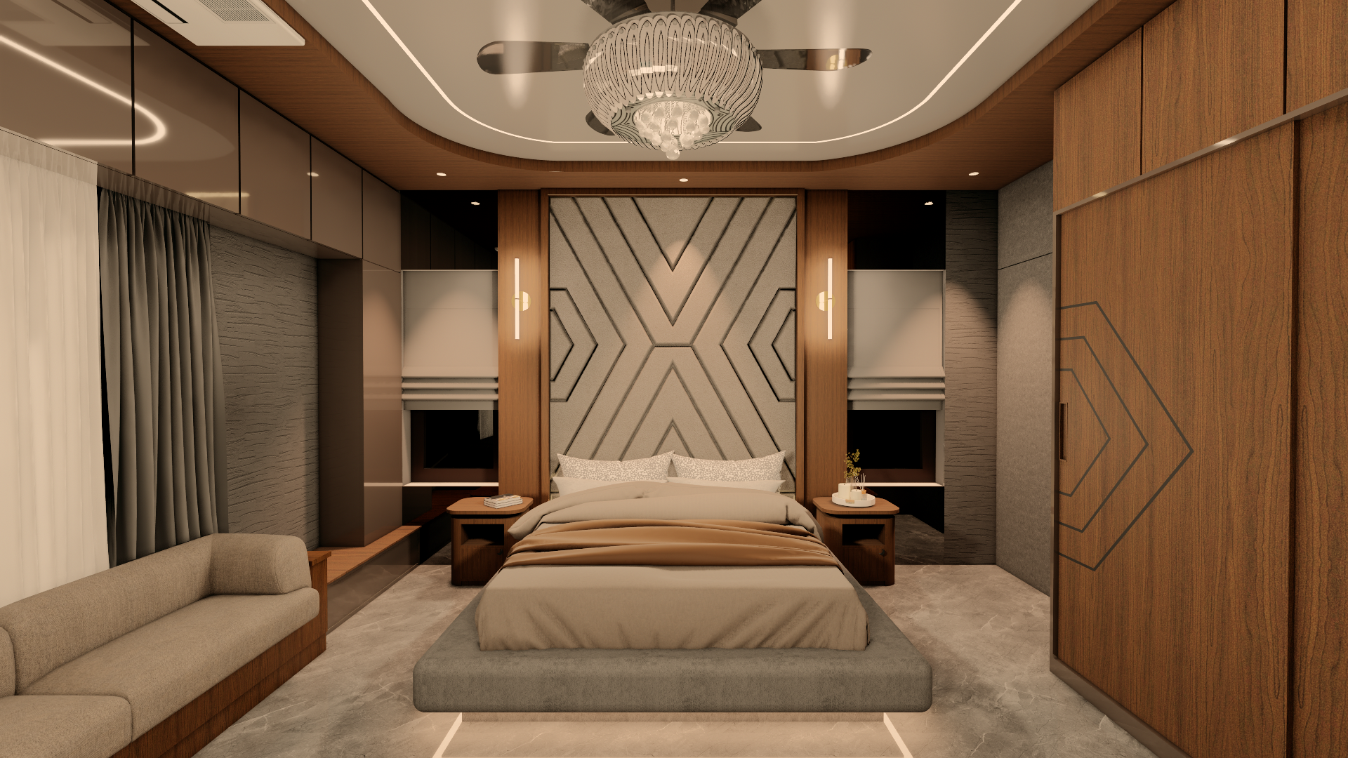 make changes in colors if required to the room with the color pallete walnut wood medium and dark grey beige and brass metal and let the room look dark but cozy and make it look realistic and make the headboard headboard fabric and grooves look realistic