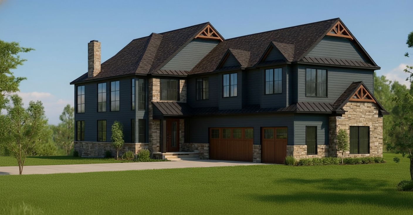 dark grey blue siding color 1e2326 black trim on the windows top cross beams and garage doors to color match brown wood