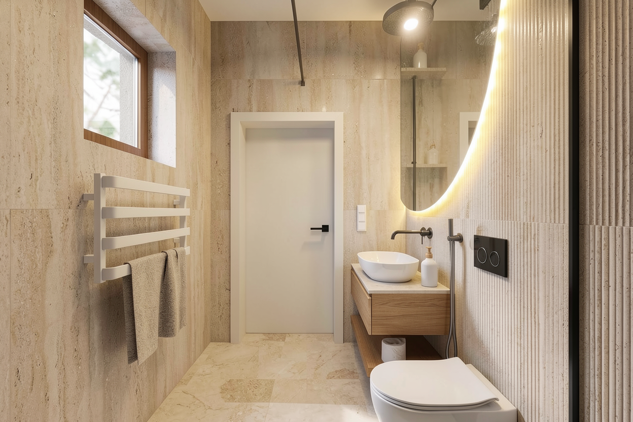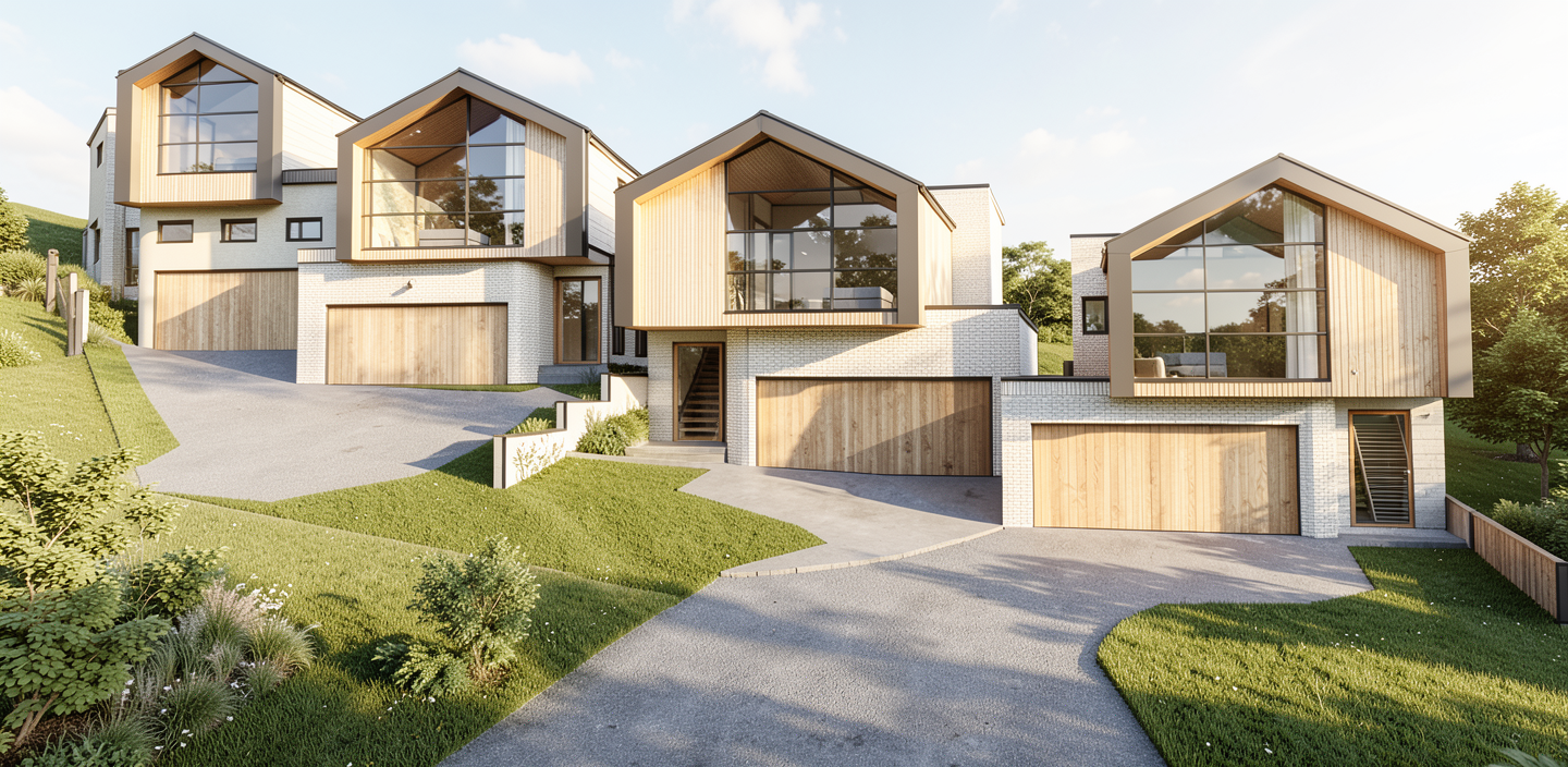 photorealistic architectural render preserve exact building massing and proportions from the reference image realistic materials wood siding dark grey brown tone and metal cladding natural quebec landscape with mixed forest vegetation soft golden hour lighting low intensity sun positioned between garage and house soft shadows slightly cloudy sky high detail textures realistic reflections and materials asphalt driveway leading to the garage high end architectural visualization sharp clean realistic