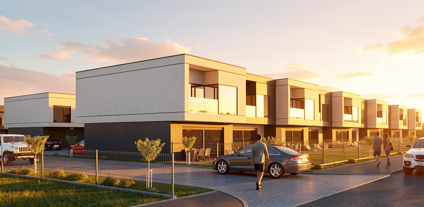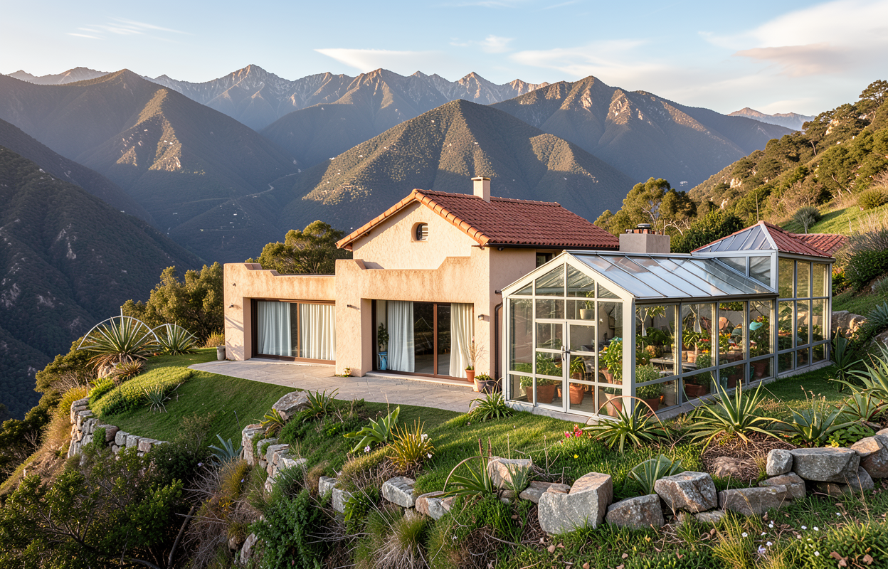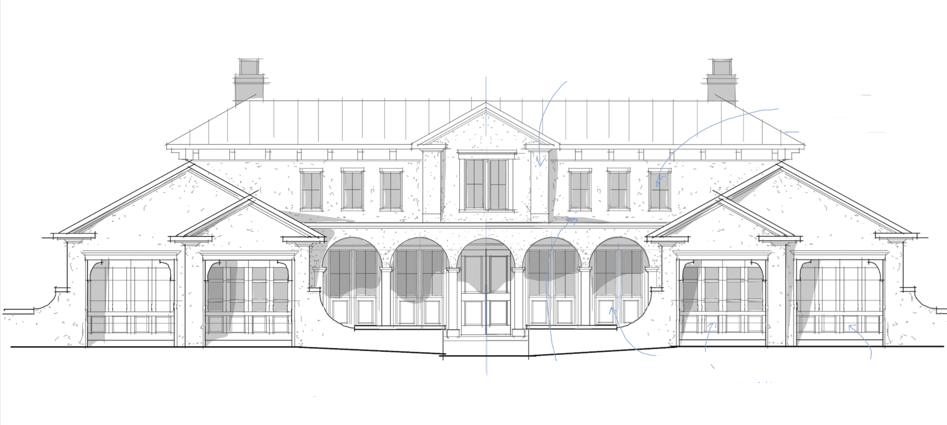 light colored stucco finish wood bracket details at garage doors dark bronze standing seam metal roof garage doors on front to have glass and wood panels below formal landscaping and trees in the background