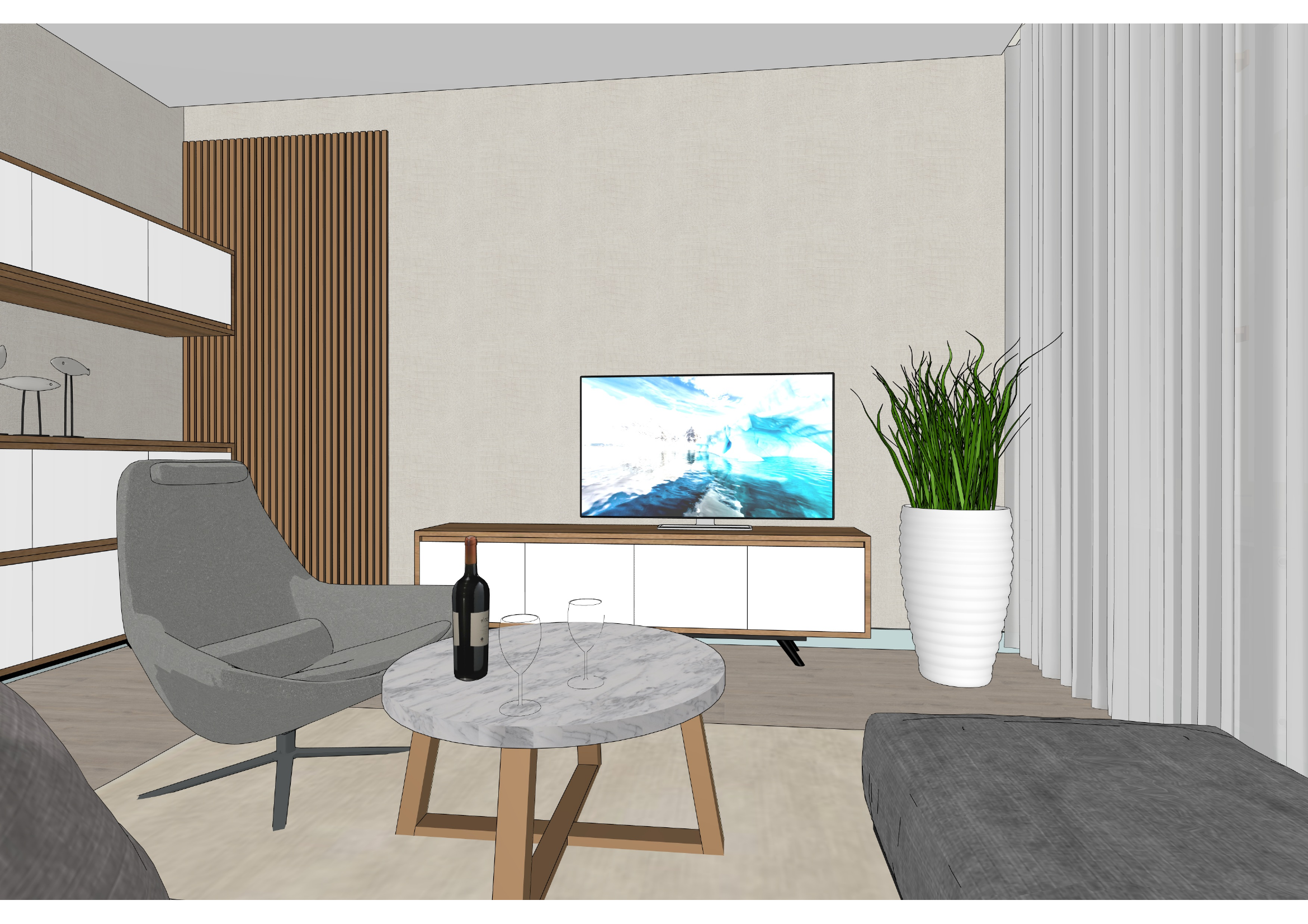 absolute priority rule the scene must remain 100 identical to the reference image any modification is strictly forbidden except explicitly defined adjustments no redesign no reinterpretation no geometry changes do not add any objects decorations flowers plants or details of any kind do not remove any objects keep everything exactly as in the original scene allowed adjustments only these 1 wall color adjust wallpaper to earthy beige with a slightly warmer brown undertone maintain subtle textile texture 2 ceiling strict geometry rule ceiling must remain perfectly flat one continuous plane no curves no deformation create 15 cm recessed gap between ceiling and walls except door wall if visible integrated led strip in the gap light soft indirect wall washing no visible source 3 curtain lighting controlled accent add led above curtain very soft turquoise light illuminate only curtain fabric must not affect walls affect ceiling affect furniture materials locked no interpretation floor light wood beige rug 2 cm cut pile coffee table walnut base marble top cabinets walnut white semi gloss laminate slat panel walnut on black background sofa chair grey textile plant natural green pot white matte ceramic all materials must remain exactly as in reference lighting final control main light daylight from behind camera soft frontal evenly distributed no harsh shadows led ceiling gap warm neutral curtain soft turquoise localized only global illumination physically correct gi soft contact shadows natural bounce light ambient occlusion slats corners ultra realism system micro detail wood grain marble roughness textile fibers slight film grain 1 1 5 microcontrast boost soft highlight roll off shadow depth soft contact shadows depth via ao slat shadows no flat look reflection control no perfect reflections marble diffused laminate controlled semi gloss ceramic matte exposure color no burned whites neutral grading no saturation boost camera original camera unchanged eye level 35mm equivalent output 8k resolution photorealistic luxury client presentation hard negative rules do not change ceiling geometry do not spread turquoise light into room do not add remove objects do not alter composition do not redesign anything final rule this must be a photorealistic render of the same scene not a modified version