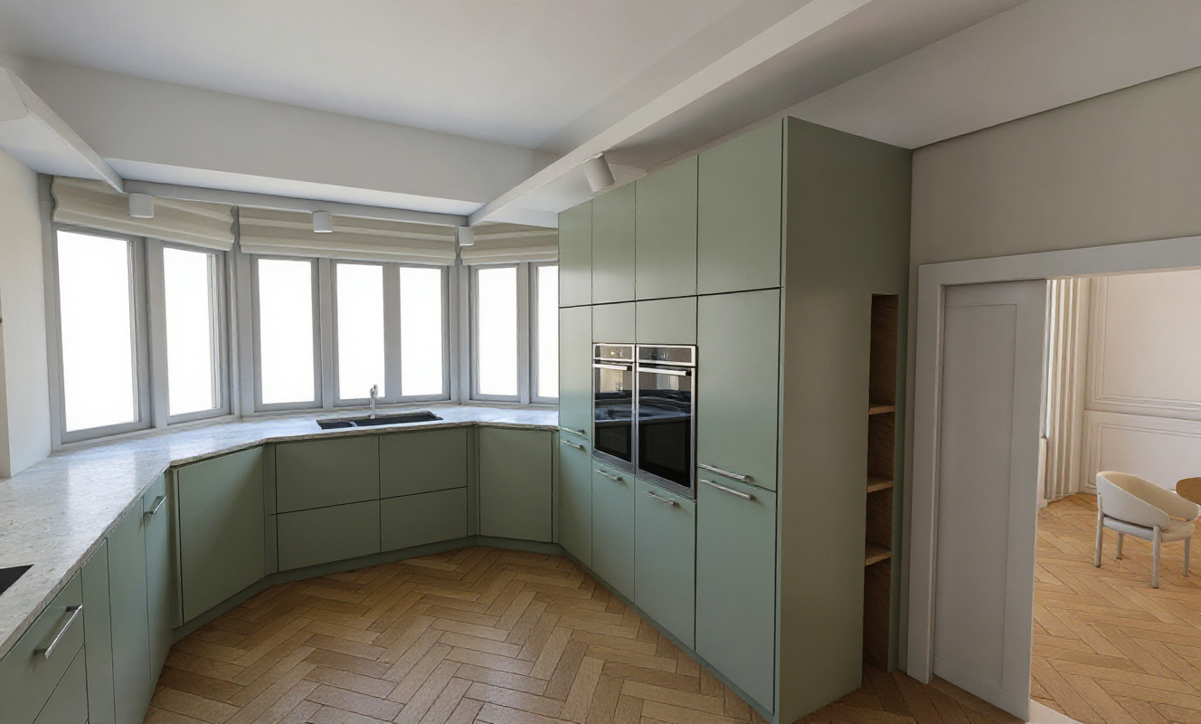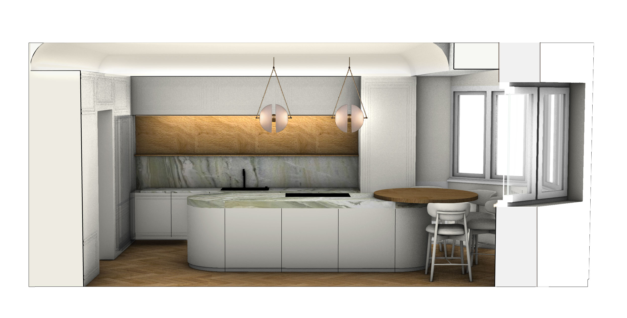 kitchen with a lot of moulding on the surfaces and indirect lightning on thge celling and workspace