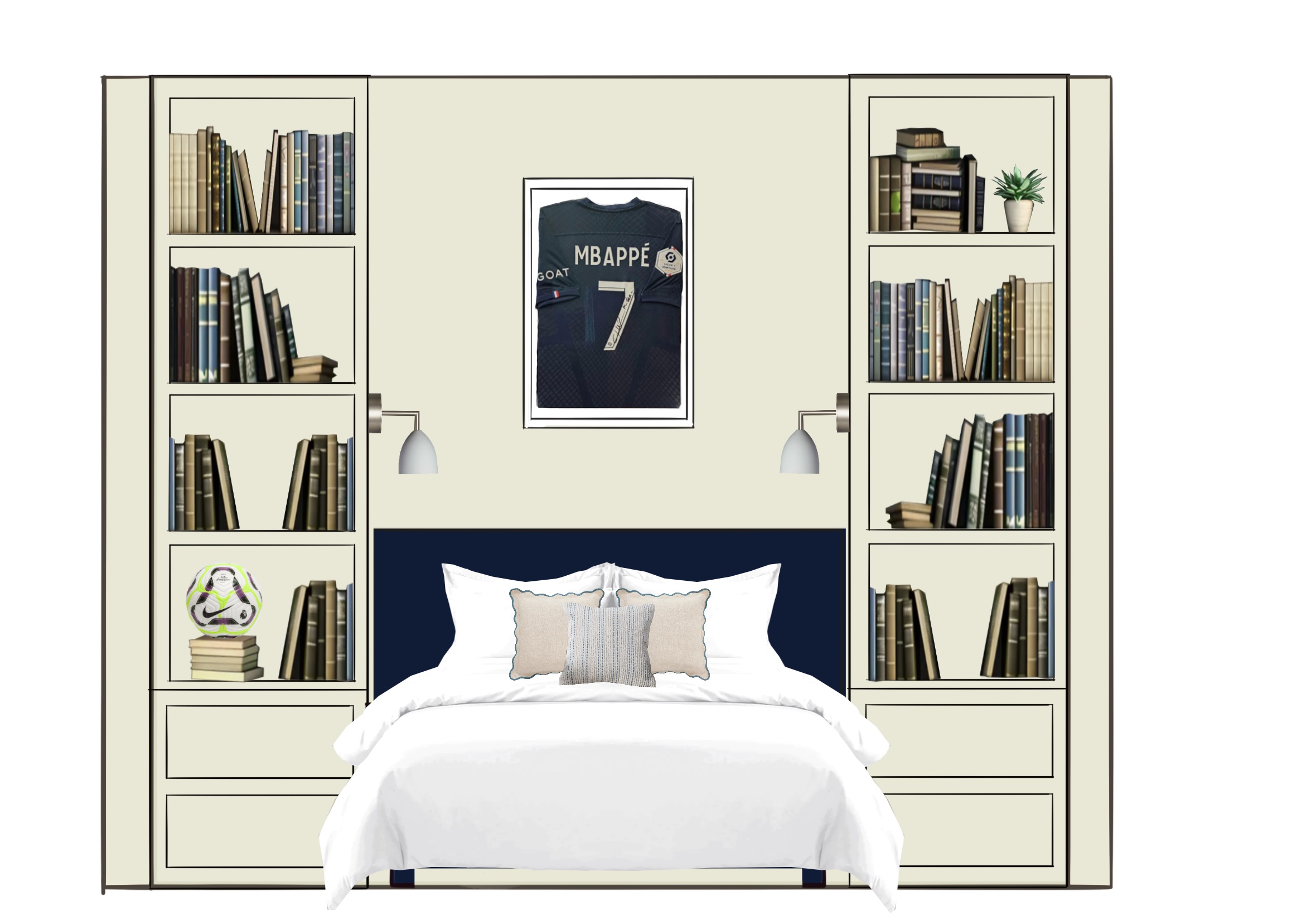 create a photo realistic render of this photo replace lots of books with boys toys on the shelves on top left and right 2nd shelf from the top add 2 rattan basket for storage on 2 of the shelves there should be 8 shelves in total keep the football on some books but remove the books on the side add boys toys car aeroplane bike globe basketball rugby ball some books for kids aged 8 12 should be added