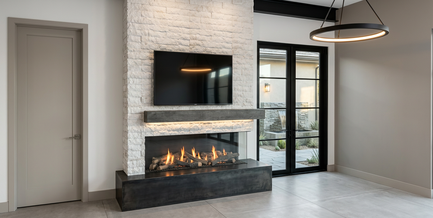 enhance the existing finishes in this contemporary mountain cabin kitchen lighting should be daytime ultra realistic photo like you would see in a design magazine include undercabinet lighting on either sides of the range hood the floor should be a light oak wood plank with light knots and texture