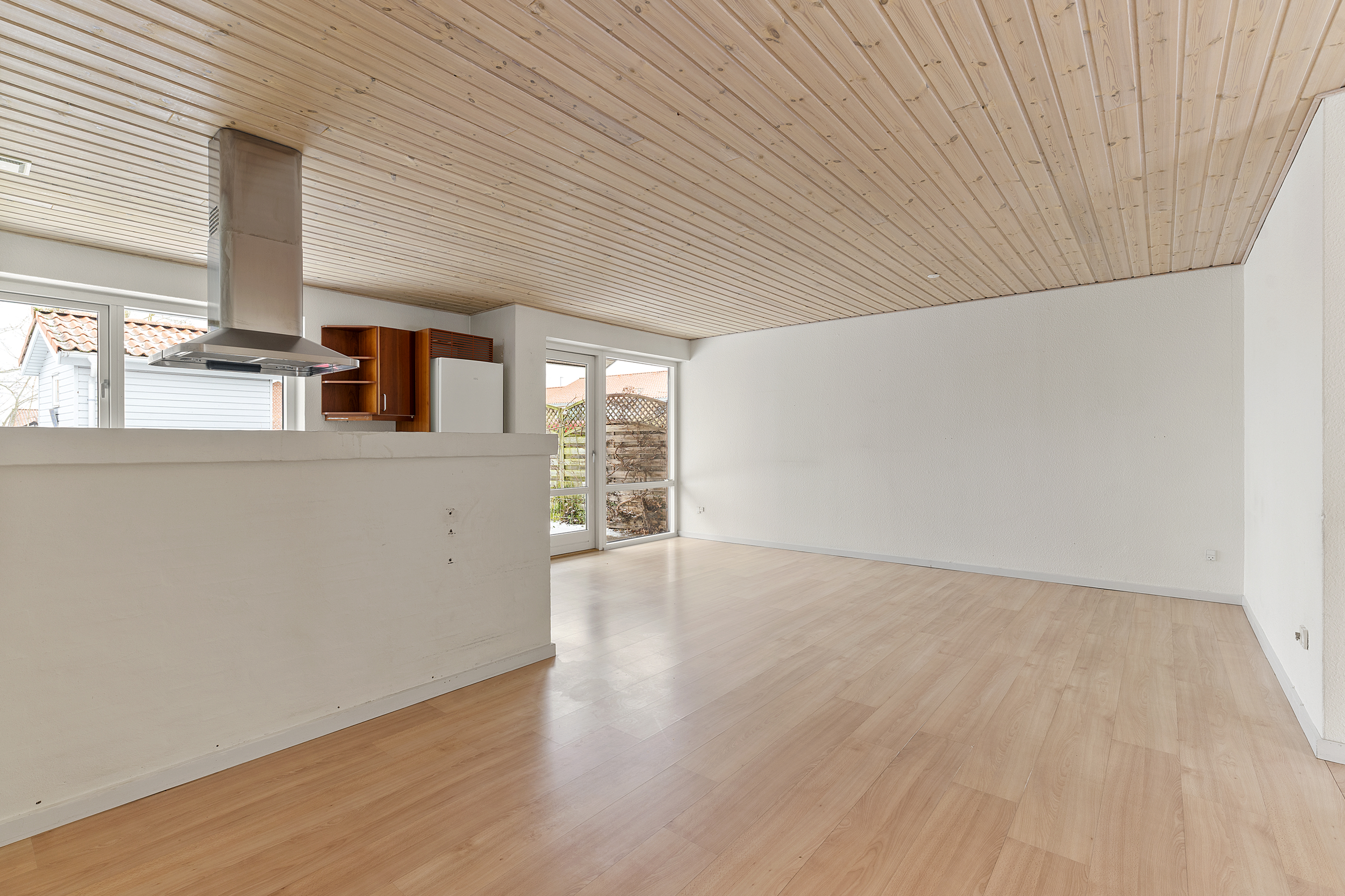 design the entire room in a modern new nordic interior style include a dining table with six chairs placed in front of the kitchen with stylish pendant lamps hanging above the table in the back of the living area arrange a comfortable sofa setup with a coffee table oriented toward the terrace door creating a welcoming lounge space with a clear view outside