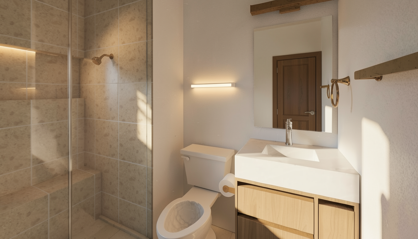 refine this one use same strategy run this view add niche and wall scone light no light at shower head this is good use this strategy render another view only one horizontal light in shower no scone light on wall sunny day outside window this is good use same strategy render this one no window it s a mirror no window reflection in mirror no scone above toilet no window it s a mirror show bathroom door in the mirror reflection no window in shower this is good no outdoor light sources warmer tone no outdoor light source no outdoor light sources no window no scone light above toilet no outdoor light source