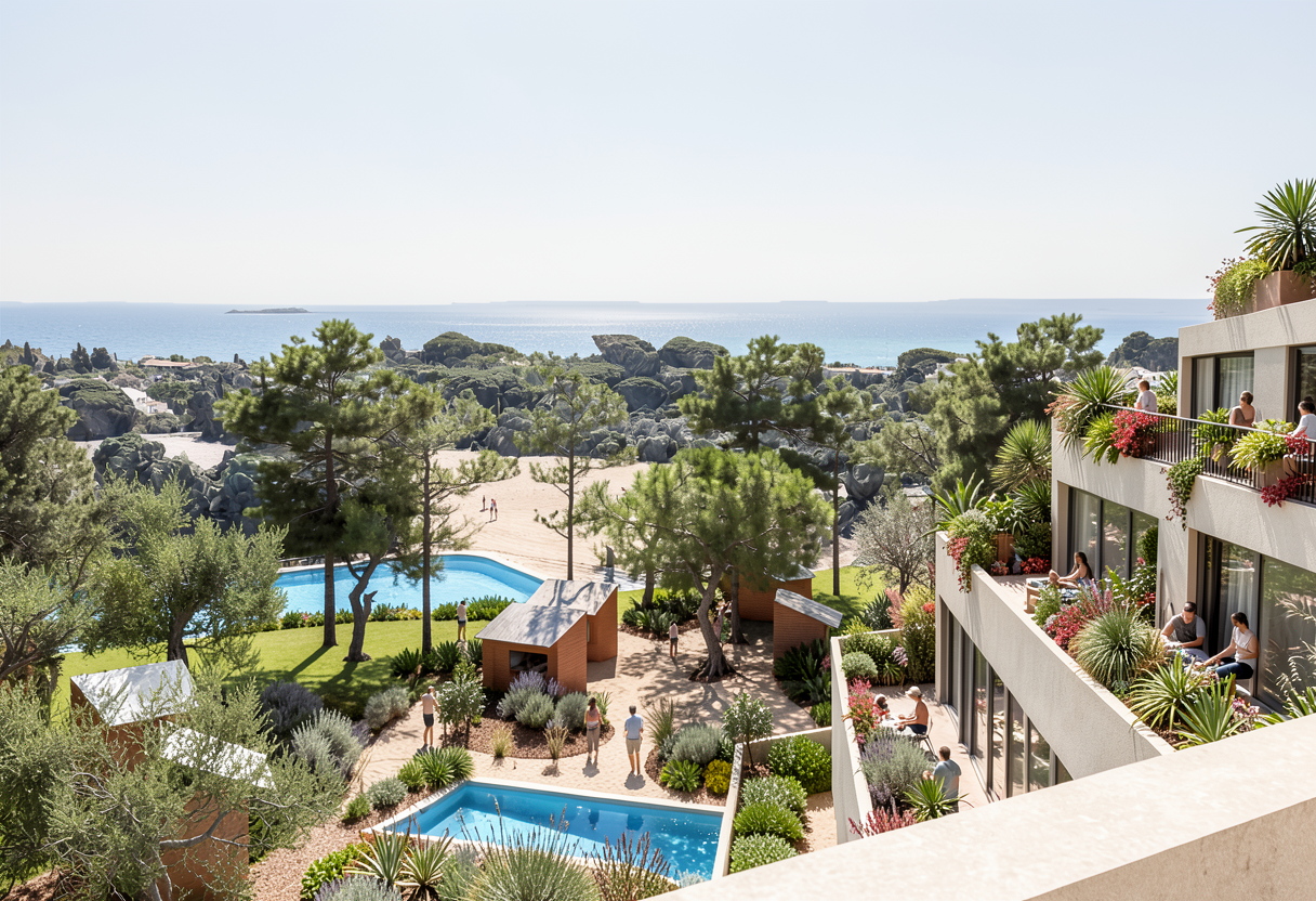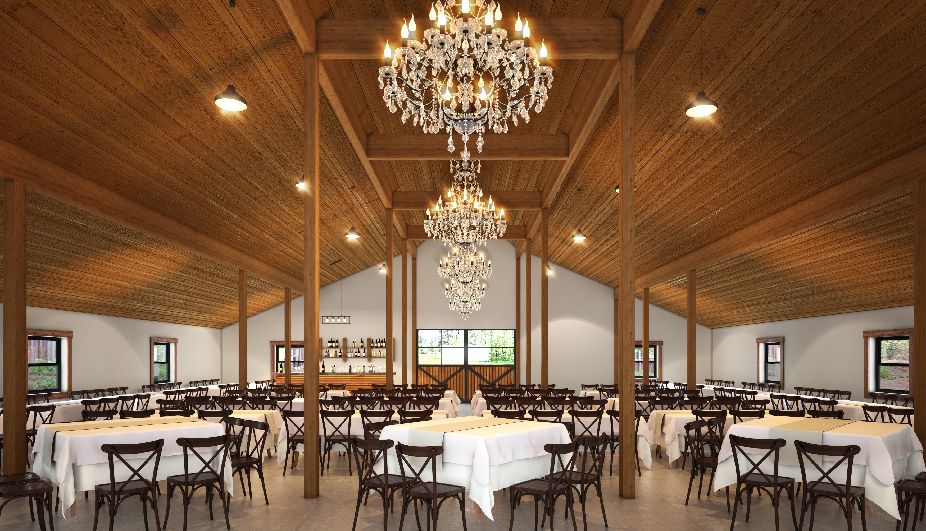 a warm timber interior architectural visualization wide angle wedding space with natural wood ceilings vertical timber wall panels oak flooring and daylight filtering through large windows calm and serene atmosphere cinematic interior render soft shadows muted neutral palette scandinavian japandi influence editorial architectural composition calm spatial depth conceptual yet realistic presentation concrete floors