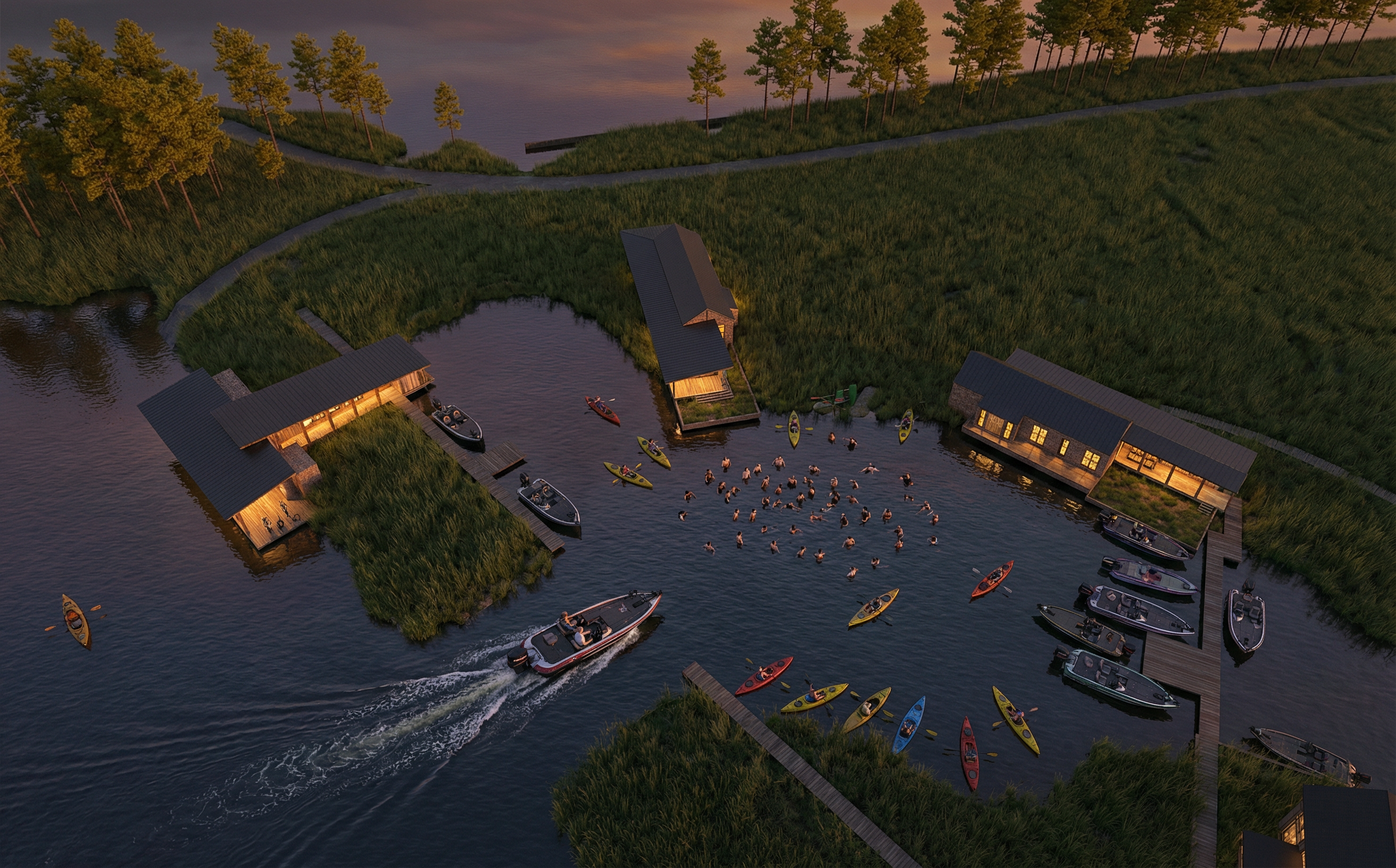 detail shot of an antique brick house with a soldier course at the top of brick walls with timber columns steel beams reclaimed pine soffit yellow pine trees in the background landscape to be tall wild louisiana grasses a large group of people swimming in the water people on kayaks bass boats in boat slips and a bass boat driving to the boat slips scene to be dusk with soft glowing light coming from buildings the two bodies of water are not connected