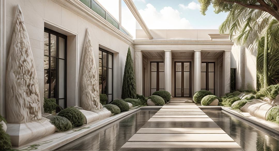 emphasis the classical elements on this modern house make the stoned cladding smooth add mediterranean style landscaping add lighting to the interior of the house keep the roof flat